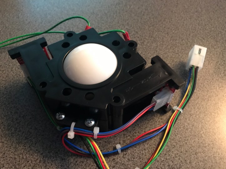 I haven’t quite figured out how I want to mount it yet. Normally they have a thin metal plate – I really want to have the Control panel graphics come right up to the edge of the ball. To do that – not use a metal mounting plate and have it all work – is eluding me at the moment. I think the first step is to go find some 1/16″ Lexan and see how it looks and determine if I can get a graphic to stick to it from the underside..