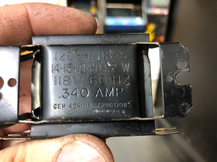 Here is the ballast – looks like a transformer – but its an inductor. It limits current to the tube (as I understand it) Turns out they die – my Defender cabinet has the exact same one and it had failed also – making diagnostics tricky since they were both reading 14 ohms .. Not a dead short.. but enough to fry tubes.