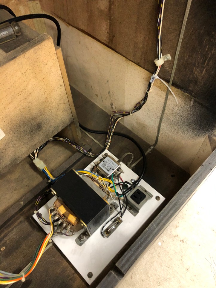 Not the best looking power supply I’ve ever seen. Its mounted on MDF – and I’m pretty sure its original. Normally I try to keep everything original as I can, but not this. After washing it up, the utility outlet is fine, not crazy about the fuse holder. Next order to Arcadeshop I may add a new one in.