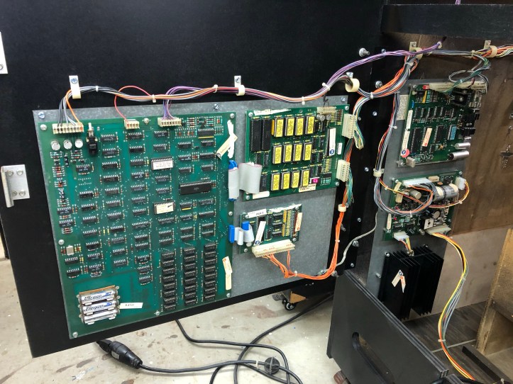 Fast forward a few hours – got the power regulator, sound board and system board in place with the wiring harness back in its original spot. Look close – LED reads ‘0’ a joy in any Williams owners eyes. I’m using lithium AA batteries on the board. They are designed not to leak. So no board damage in this machines future.