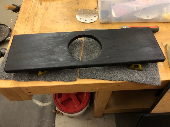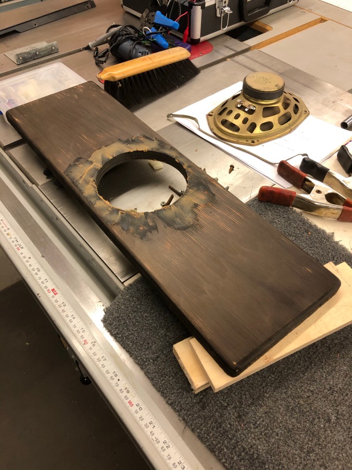 Staples and bolts hacked up the opening. I’m filling with epoxy filler here. If I leave the bolt holes – the marquee lighting will show through. Have to wait for the new speaker anyway.. I also noticed they used a black stain on this board. It shows black under the marquee bracket, its long since faded to brown. Once this is all smoothed out I’ll re-stain it black.