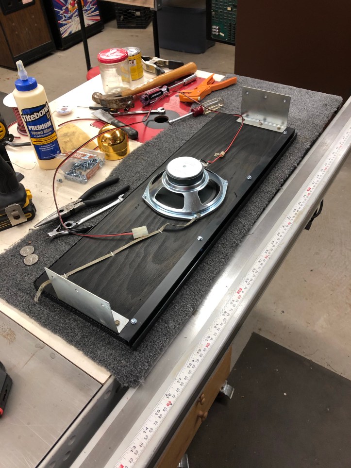 Got the cashbox door in place and the marquee lighting set up. However – it didn’t work. I checked connections, used the meter to test voltages, blew a couple of (new) bulbs before learning all about florescent lighting.