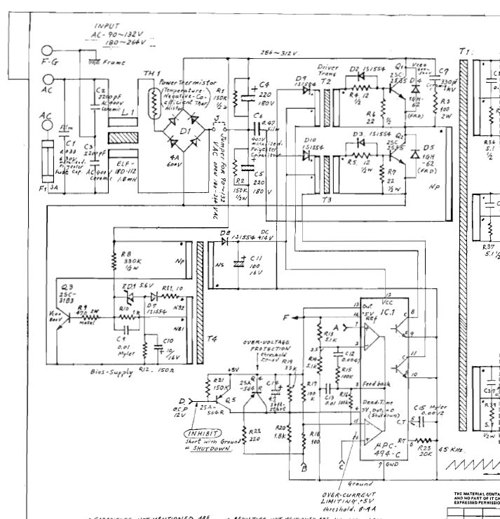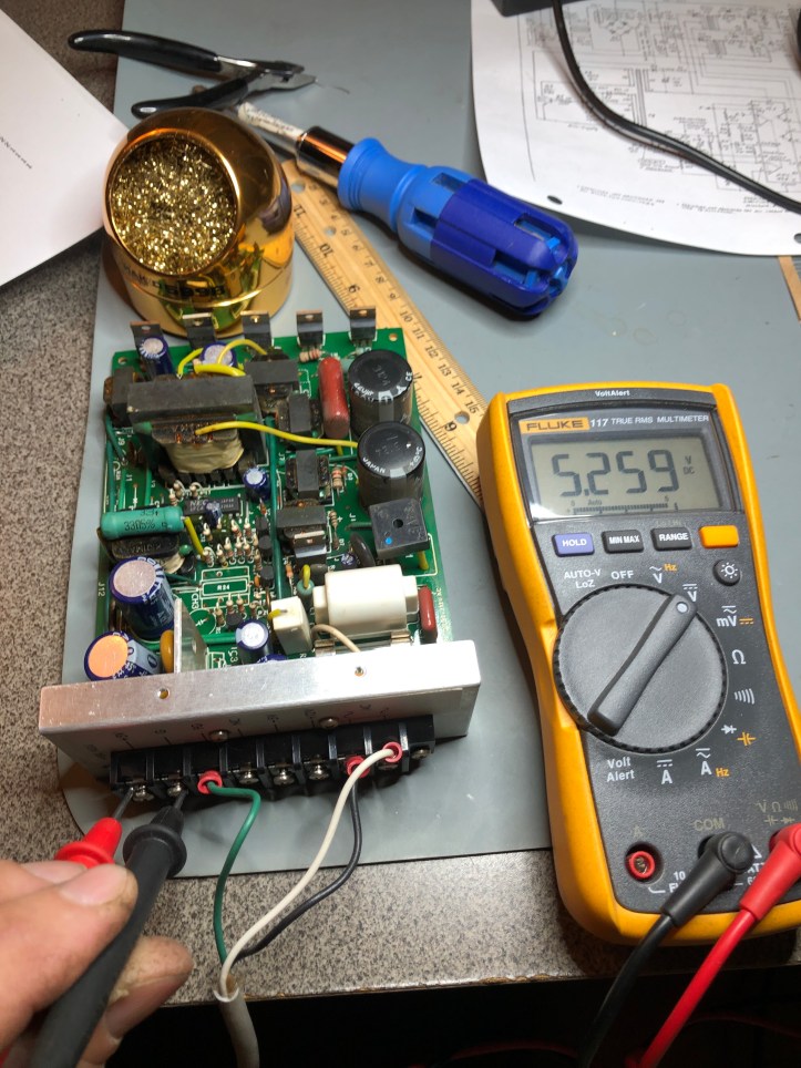 Even though my switcher was running, I wanted to fix the original power supply (PSR-703-AE). It showed voltage at the outputs of the bridge rectifier and pretty much nothing after that. Transformer T1 was never getting powered up. Probing around showed most of the PS was dead. Turns out R8 is the $.10 fuse that shuts down the whole thing when it dies. It tested open on the board (and off). Popped in a new one and it’s all set. Who says switchers are bullet proof.. They need some help after 40 years too..