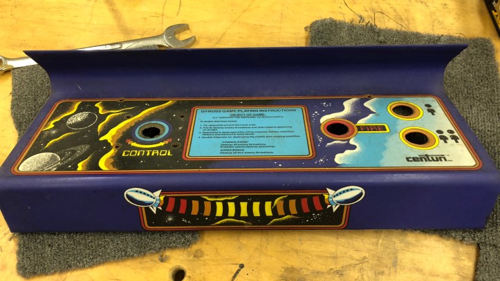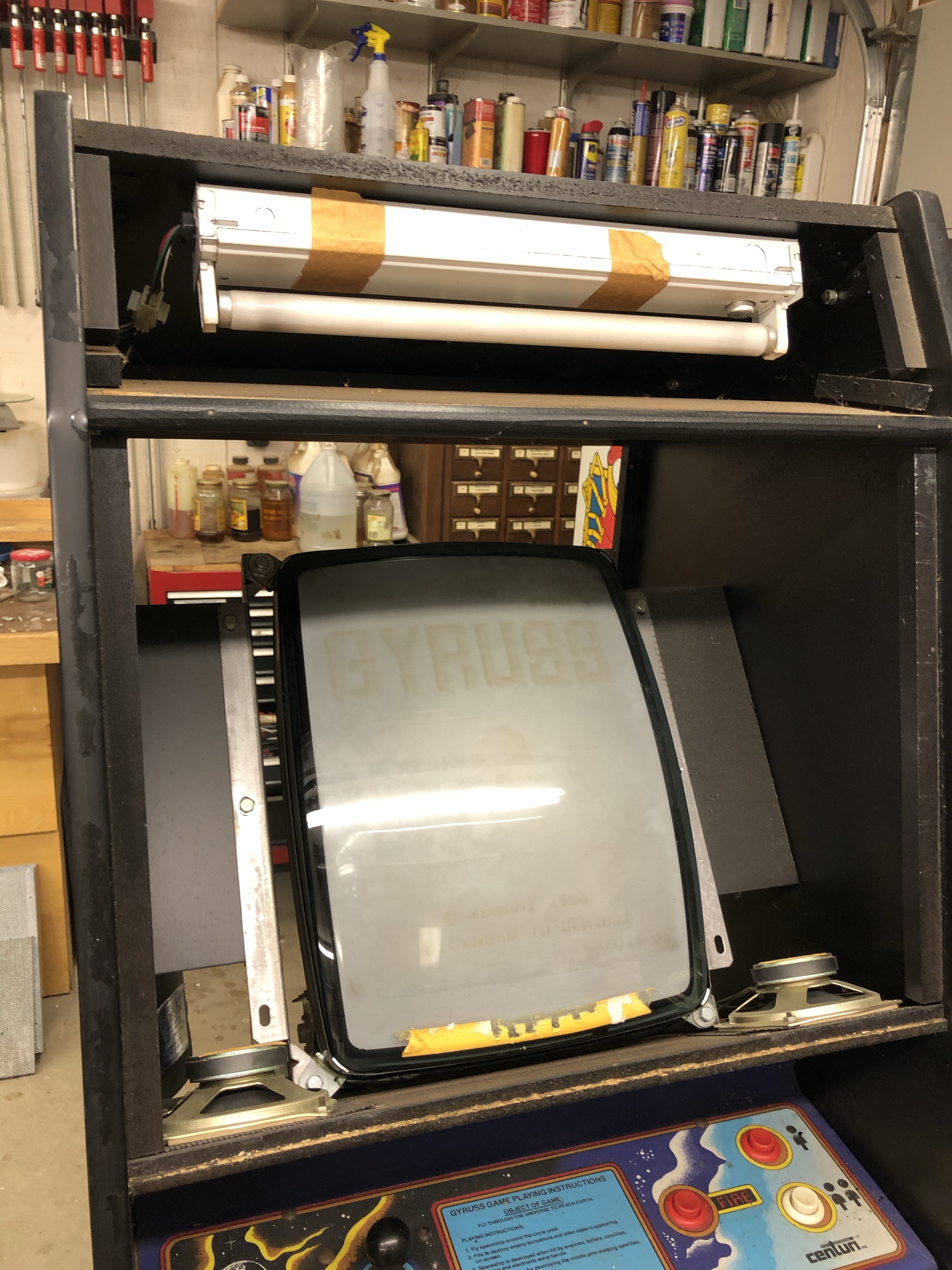 The light fixture is not only original, its never been opened. The bulb didn’t fire up – but I’ve learned from the Joust cabinet – check the resistance on the ballast before putting in new bulbs. A bad ballast will eat a new bulb in under 2 seconds.. This one measured over 25 ohms. Bad ones are down in the single digits or low teens. A brand new ballast is about 30-32 ohms. It needed a new starter and a bulb.