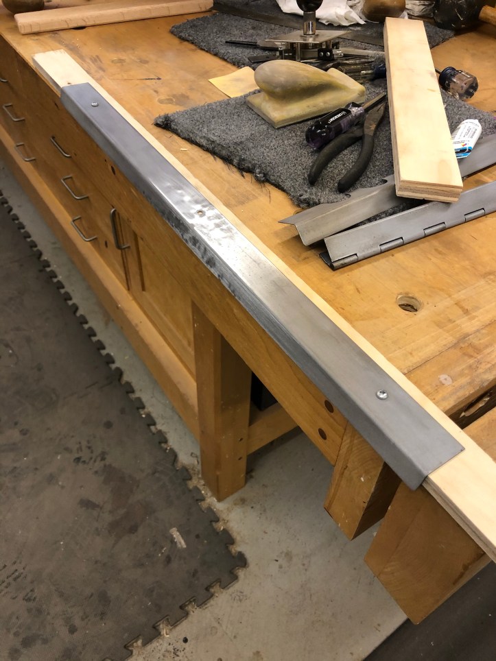 The marquee brackets were rusty, but the upper one had also been folded. Someone had clearly missed the middle screw when trying to take it apart. Using some auto shop bodywork skills from forever ago.. I hammered out the fold and got the part as flat as you can. I screwed it to a plywood scrap and sanded down the high spots on the metal.