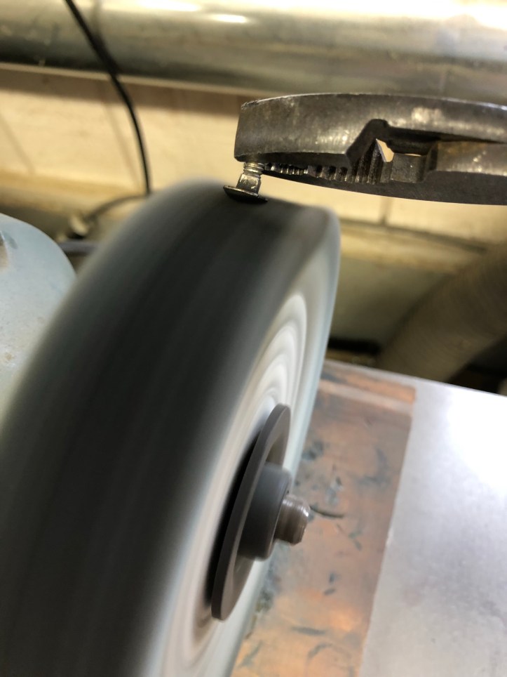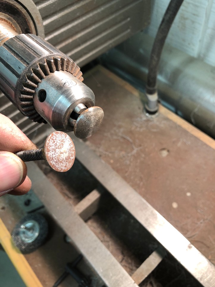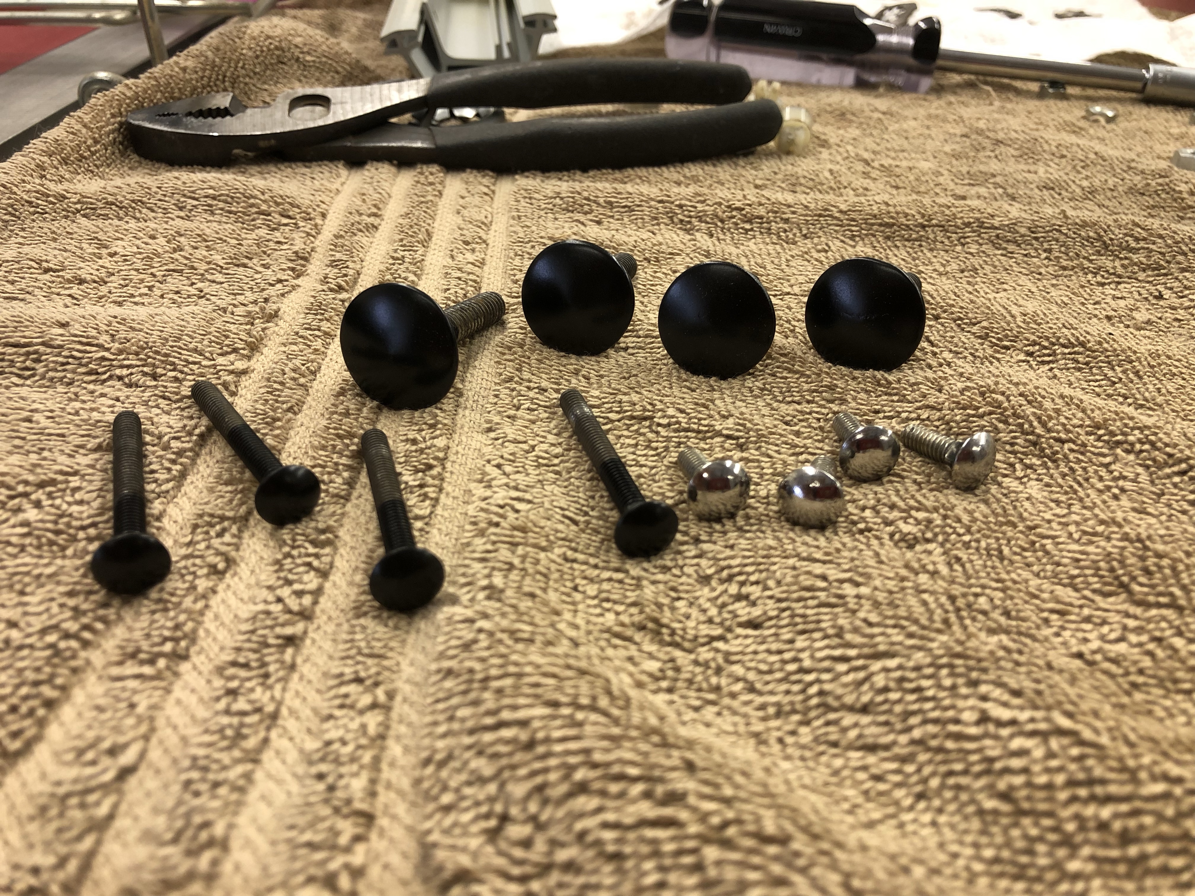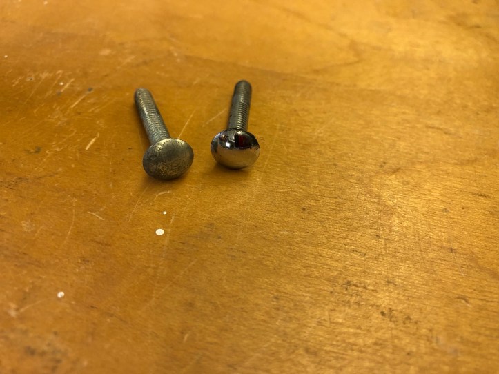 All of the bolt heads that are rusty and/or should be black get a quick spin and sand. They get painted with Satin Black. All of the heads that are supposed to be shiny/chrome get a quick buff with compound on the buffing wheel. It doesn’t take much time and they look much better.