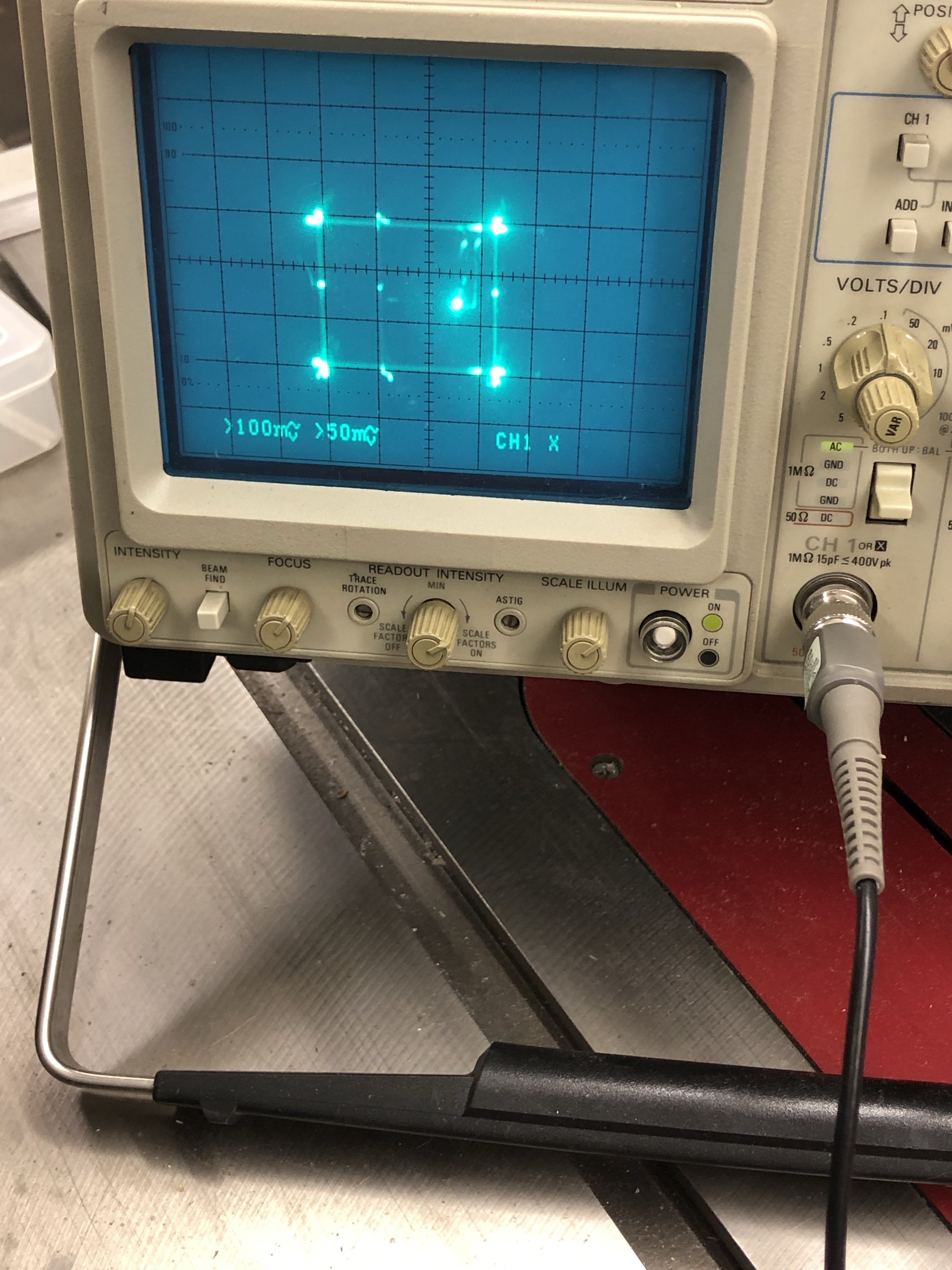 Above are the inputs to IC600 (perfectly good Star Trek) – The best way to check this is to clip on to the resistors just before the custom IC600. I clipped to the tube side of R602 and the paddleboard side of R700. This told me X,Y were getting all the way from the stack, through the limiter board, connectors and to the deflection IC. So far so good…