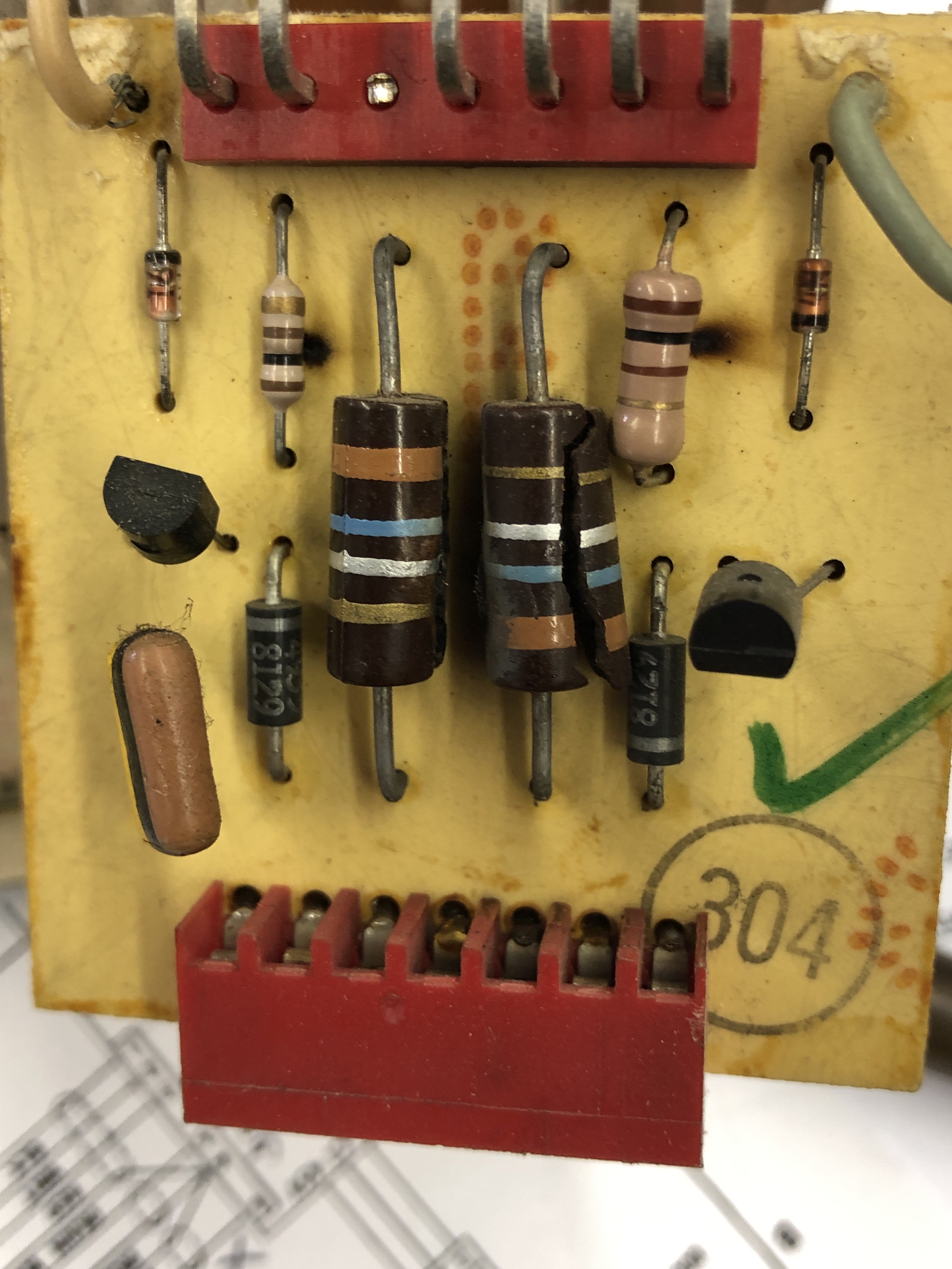 After the failures, I went through and tested all of the transistors and diodes in circuit … again. I’d also checked all of the big ceramic power resistors and anything that looked like it was designed to get hot. Some components I had to lift a leg to make sure they were good because they didn’t test well in circuit.