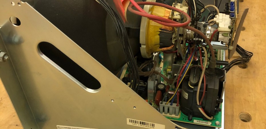 The monitor looks brand new. Zero burn. Clean. Really a great looking CRT. A Wells Gardner 13K7203, certainly not original since it was built in 2000. Doesn’t work. First testing showed it is going into high voltage shutdown. I verified this with my HV probe. Shoots way up to 24K+ volts and drains right down to zero in about 5 seconds as it shuts down. Shutdown circuit is doing its job it seems.