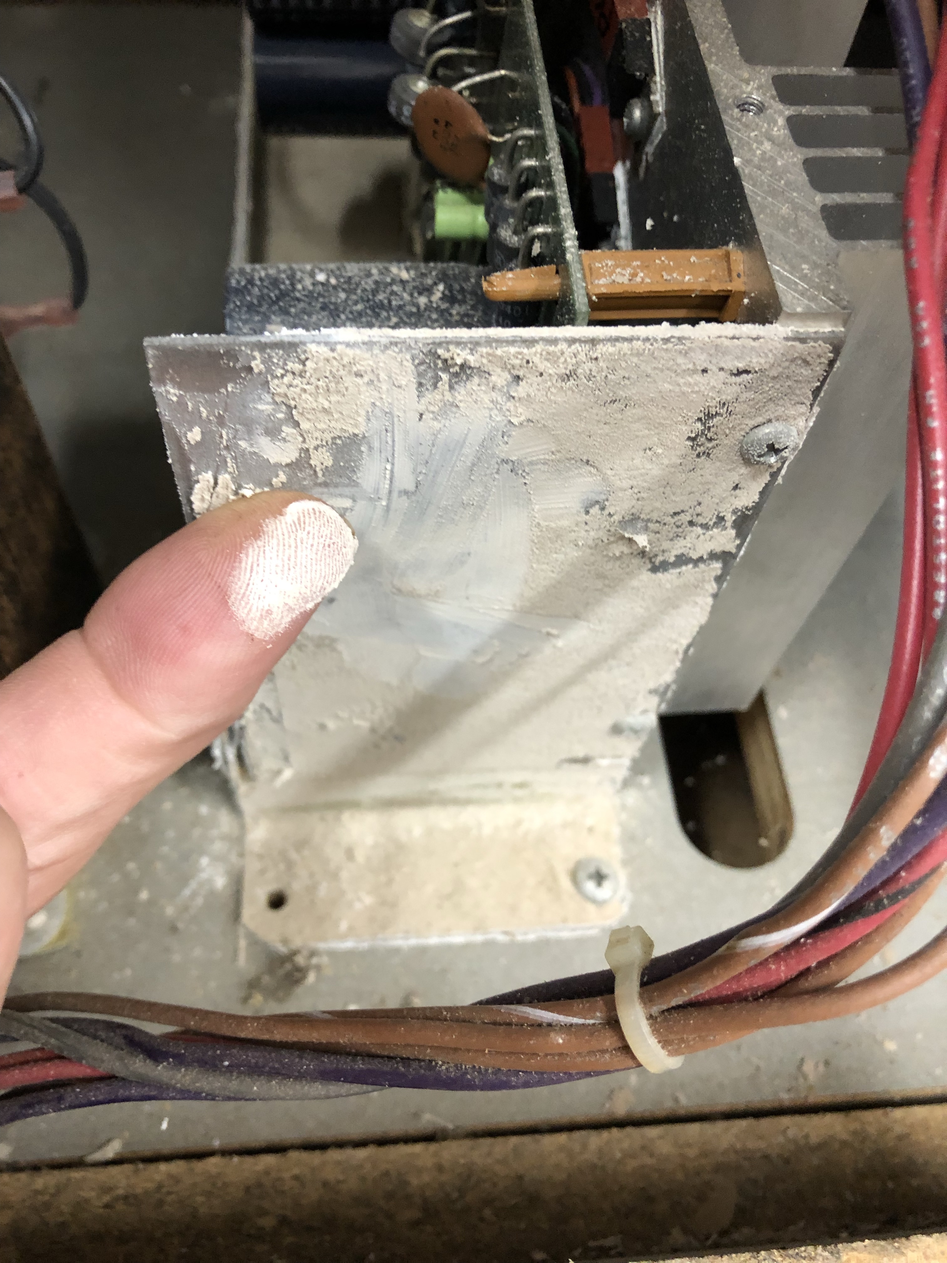 First – the cabinet all assembled is the heaviest cabinet I’ve ever tried to move. Normally I can roll one to the end of my pickup, tilt it onto the tailgate and lift the bottom up into the bed. No such luck. The cabinet is ridiculously heavy. I felt bad for the owner. He somehow smashed his finger pretty good helping me. One of the reasons is this assembly – transformer, power supply and PCB cage.. it’s convenient in some ways.. and heavy enough on its own.