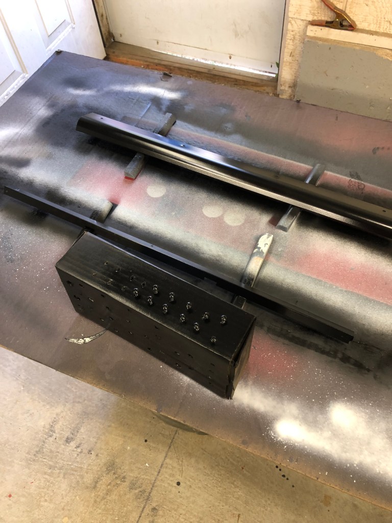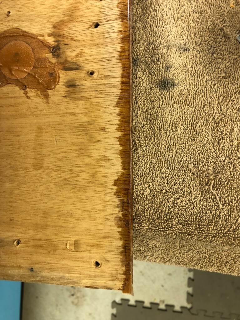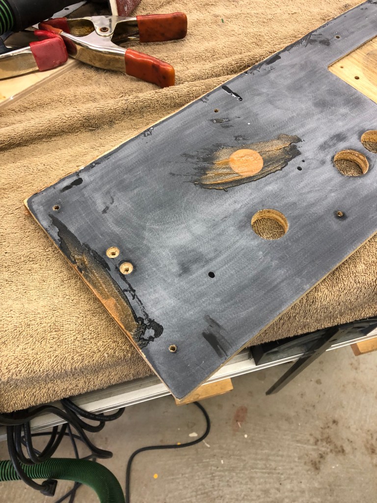 40 year old plywood edges that are not very solid got straight epoxy to firm them up.. I used thickened epoxy to fill gaps and gouges around the edges … and to secure the loose Bondo plug. I use a packing tape covered stick as a mold for the epoxy along the edge of the panel. After all of the filling and sanding, I sprayed 2 coats of a sandable/filler primer. This is the point were I will use Bondo to fill small scratches and minor surface imperfections that will show through the paint. Last step, rolled on 2 coats of Semi-gloss black Rustoleum oil based paint.