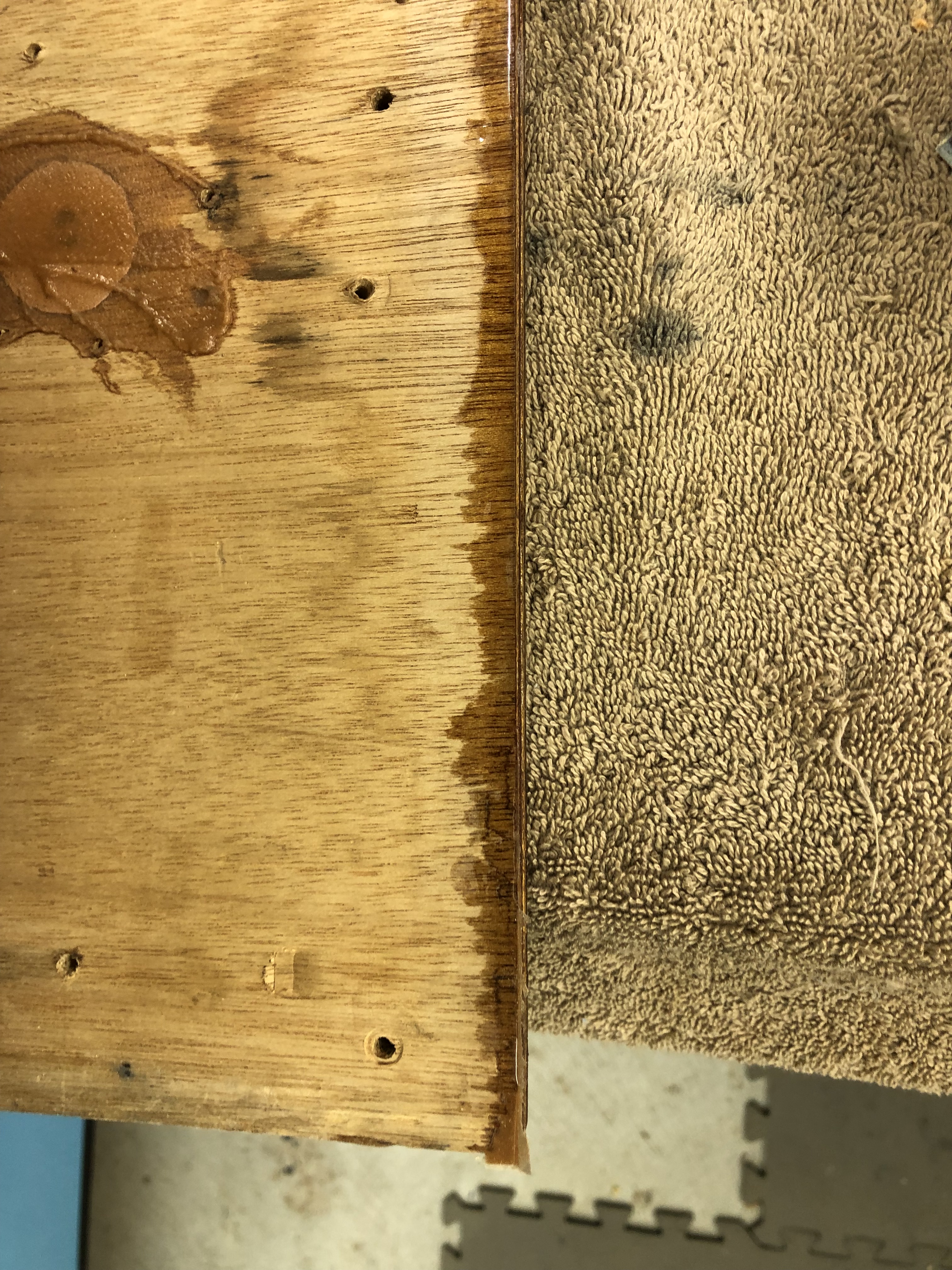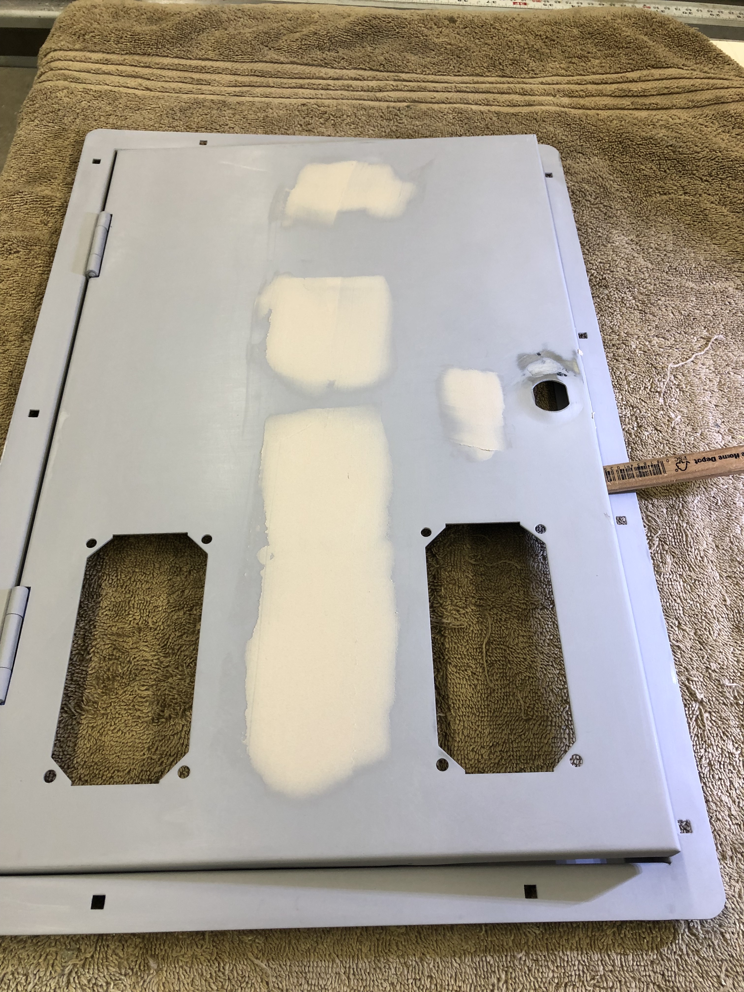 40 year old plywood edges that are not very solid got straight epoxy to firm them up.. I used thickened epoxy to fill gaps and gouges around the edges … and to secure the loose Bondo plug. I use a packing tape covered stick as a mold for the epoxy along the edge of the panel. After all of the filling and sanding, I sprayed 2 coats of a sandable/filler primer. This is the point were I will use Bondo to fill small scratches and minor surface imperfections that will show through the paint. Last step, rolled on 2 coats of Semi-gloss black Rustoleum oil based paint.