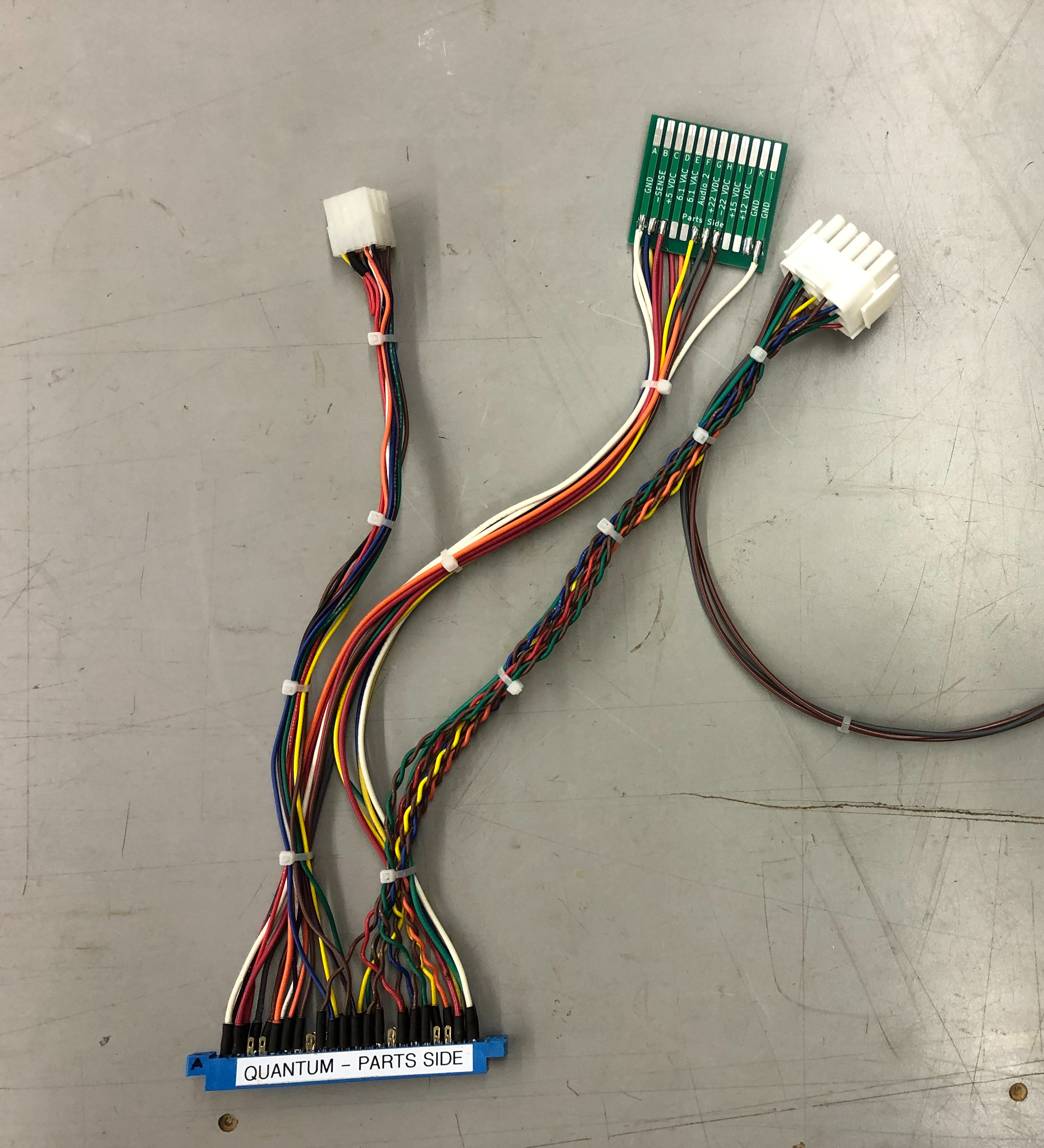 I start with just the power connections and verify and recheck them before connecting to a PCB. I can usually start working on the board with just power to start. Once I determine I need controls I wire the small 15 pin Molex to match the appropriate bench controller. Finally once a vector game is running on the scope – I wire up the large 15pin connector for my bench 6100.
