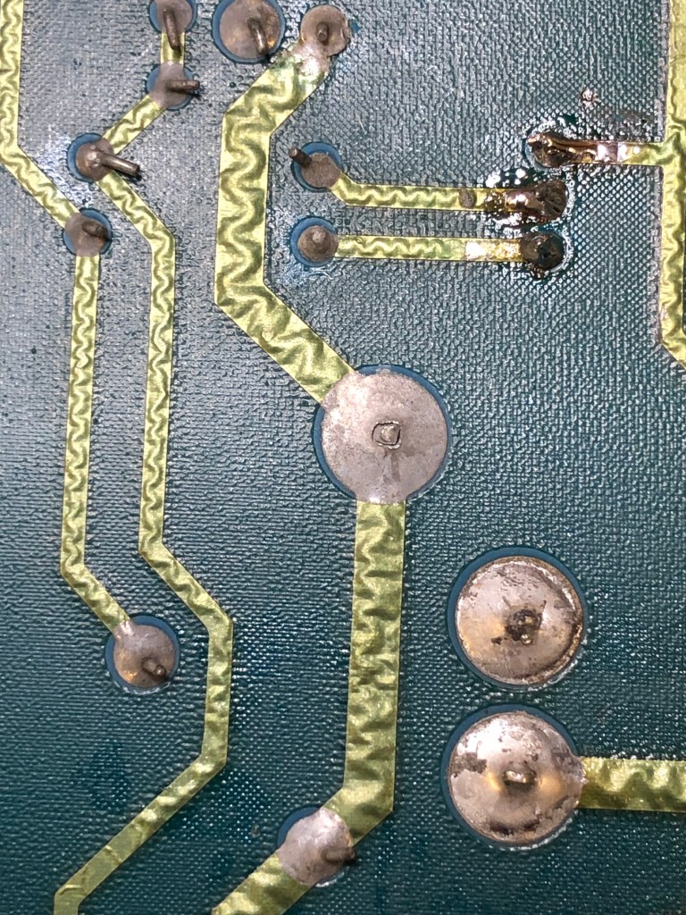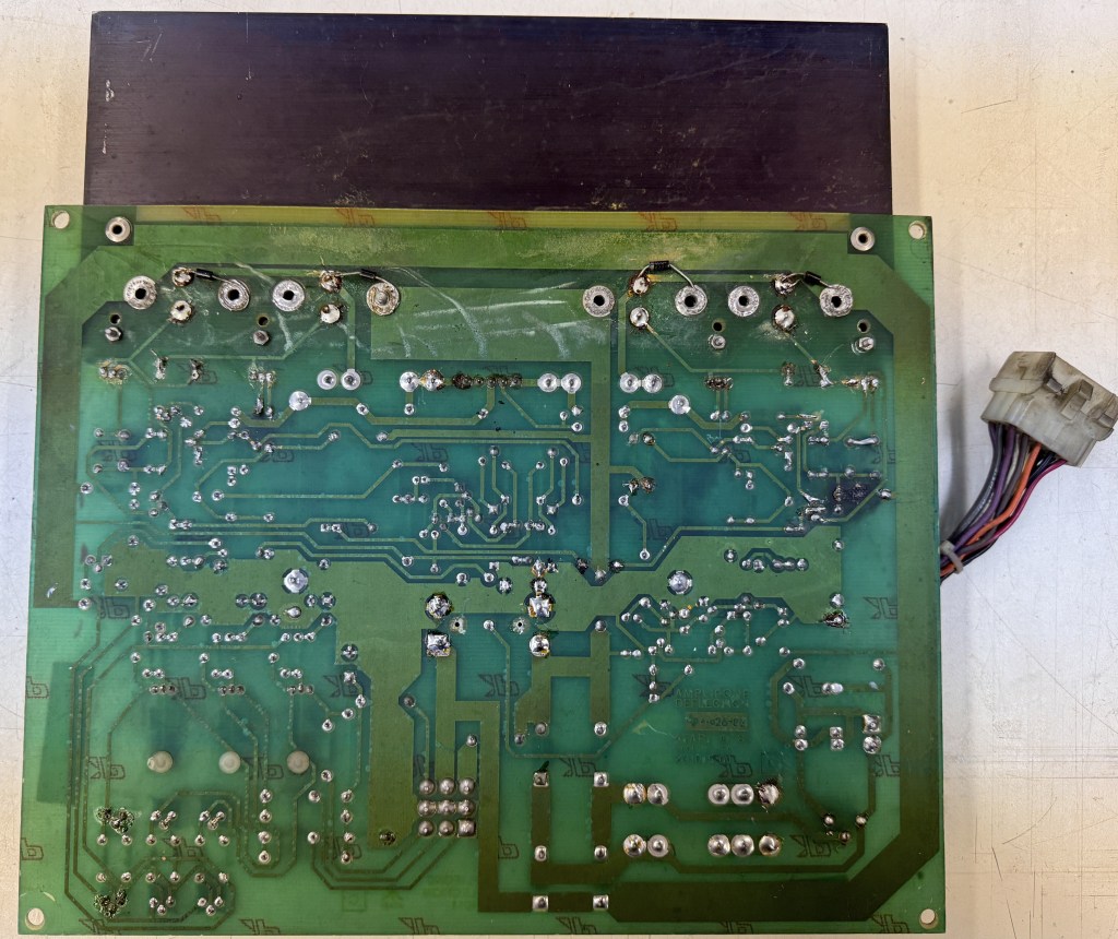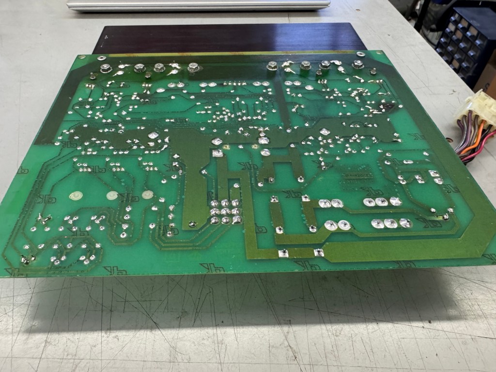 I had just got the screws out and then I remembered to take a ‘before’ pic. This one has a lot going on.. Prior burned spots, all of the zero ohm resistors are still on the board. It was dirtier than it looks. Seemed like the original caps, except for the filter caps which had been replaced at some point. There was lots of prior work and many of the traces on the backside had damage. Difficult to see all of it in this pic.
