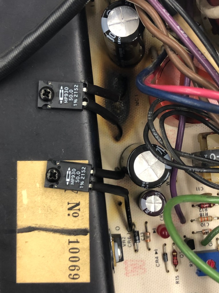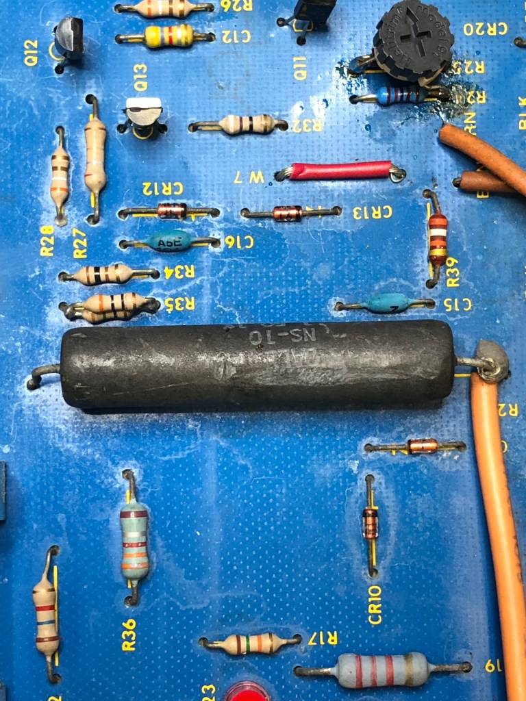 All that said – I believe the culprit was this 50 ohm wire wound shunt resistor that straddles the 7924. I can’t be 1000% sure because I have no way of testing for it.