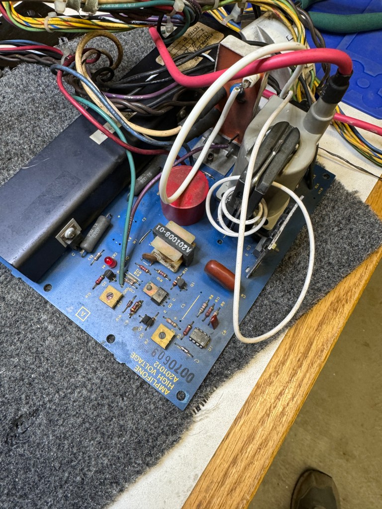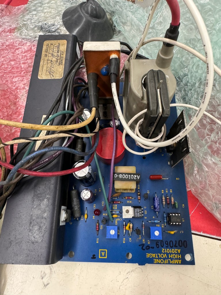 Symptom was chassis was blowing fuse F3. Interesting is the HV unit. I had not seen one of these before. Not 100% sure who made it. It didn’t need any work. I did notice that it takes significantly longer to show an image than my original HV unit. I measured 25 seconds before anything appears and 35 seconds to full brightness. Same deflection board with an original HV unit is ~14 seconds to full brightness. One more item I just learned the hard way.. This HV unit does not auto-discharge the tube. The original does. I got a little reminder pulling the anode cup off..