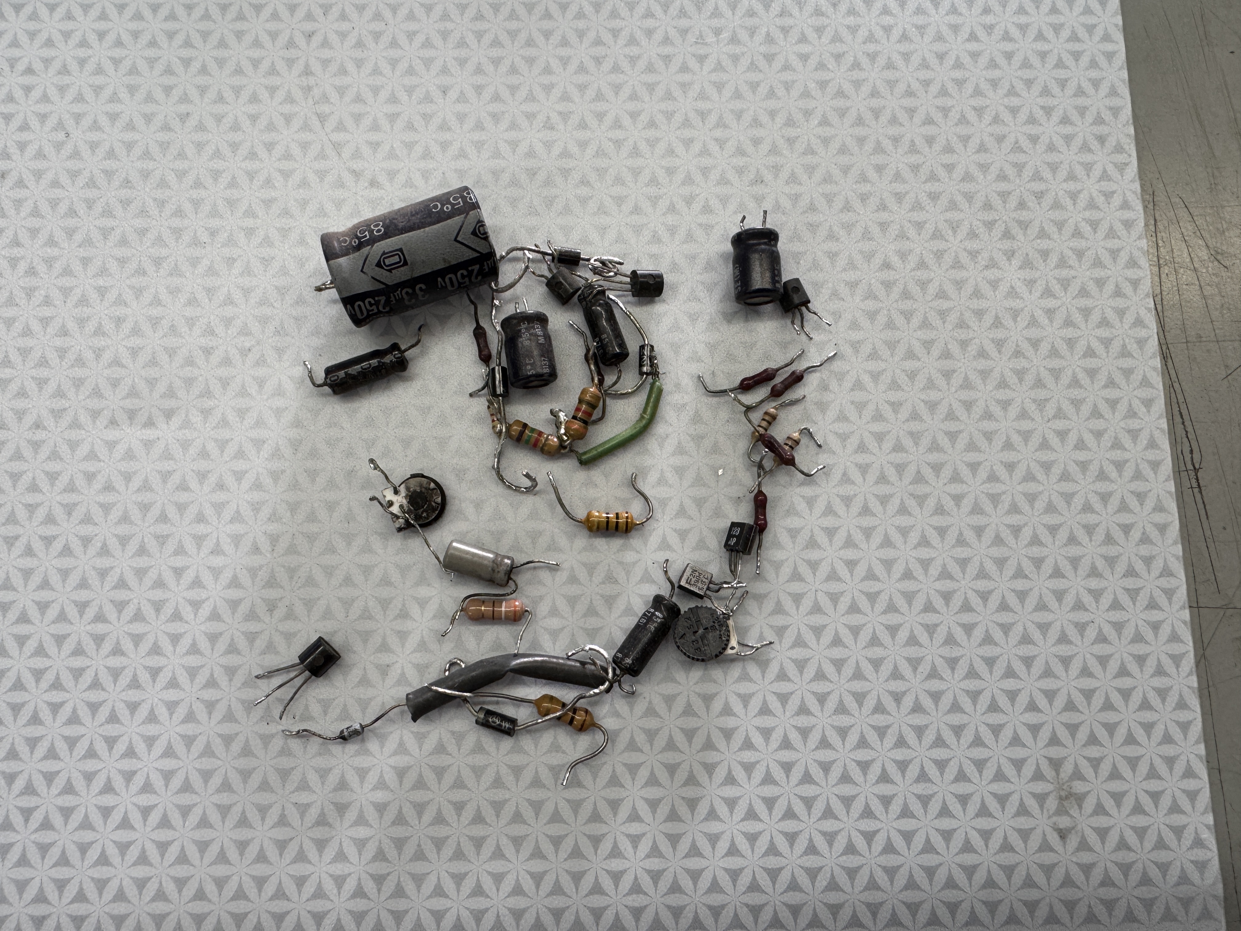 I had just got the screws out and then I remembered to take a ‘before’ pic. This one has a lot going on.. Prior burned spots, all of the zero ohm resistors are still on the board. It was dirtier than it looks. Seemed like the original caps, except for the filter caps which had been replaced at some point. There was lots of prior work and many of the traces on the backside had damage. Difficult to see all of it in this pic.