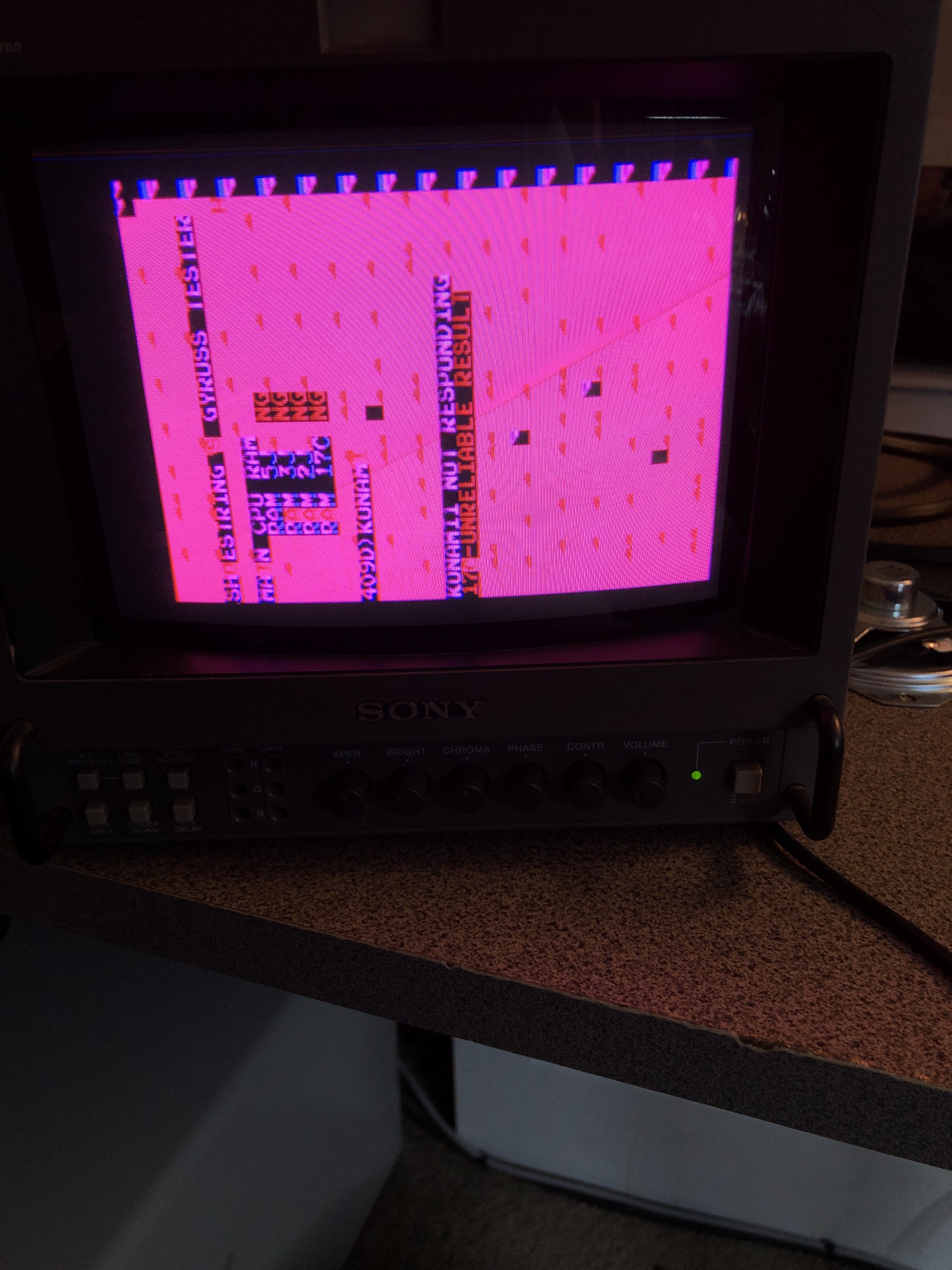 After pulling all the socketed chips, testing, etc. There were zero issues. Repaired the edge connector and powered it up. Got this. Looking at the schematic and playing the game – there were glitchy sprites with lines running through them and the character graphics would sometimes double up depending on the game code execution.