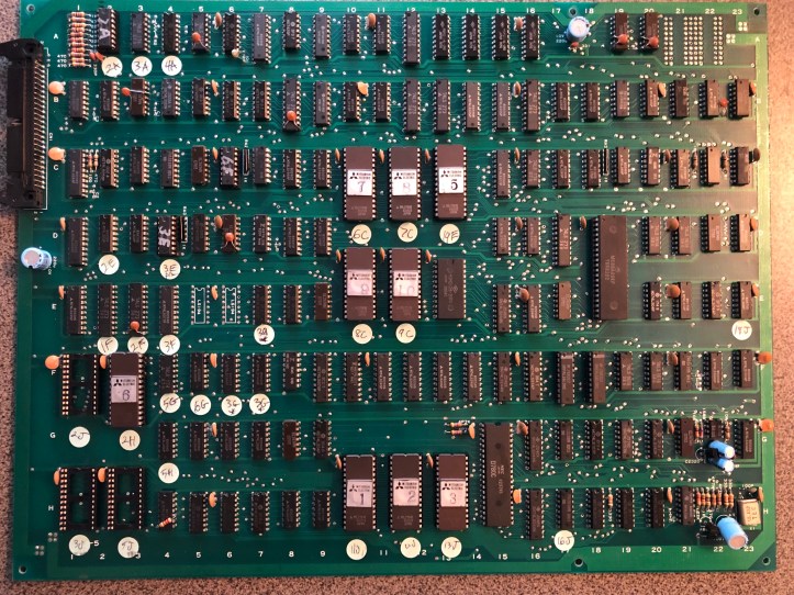 My normal routine is to pull all socketed chips, clean the legs, test any ROMs against the Mame set and burn replacements. On my first pass through – ROM GY5,6,7 checked bad.. The majority of the ROMs were Hitachi HN482764G’s. A few were Mitsubishi M5L2764K’s (which I didn’t notice – this will come back to help and haunt me later). I ordered some Hitachi’s from eBay and waited.