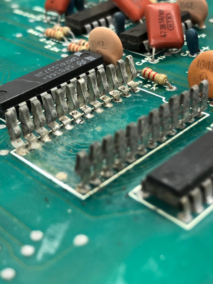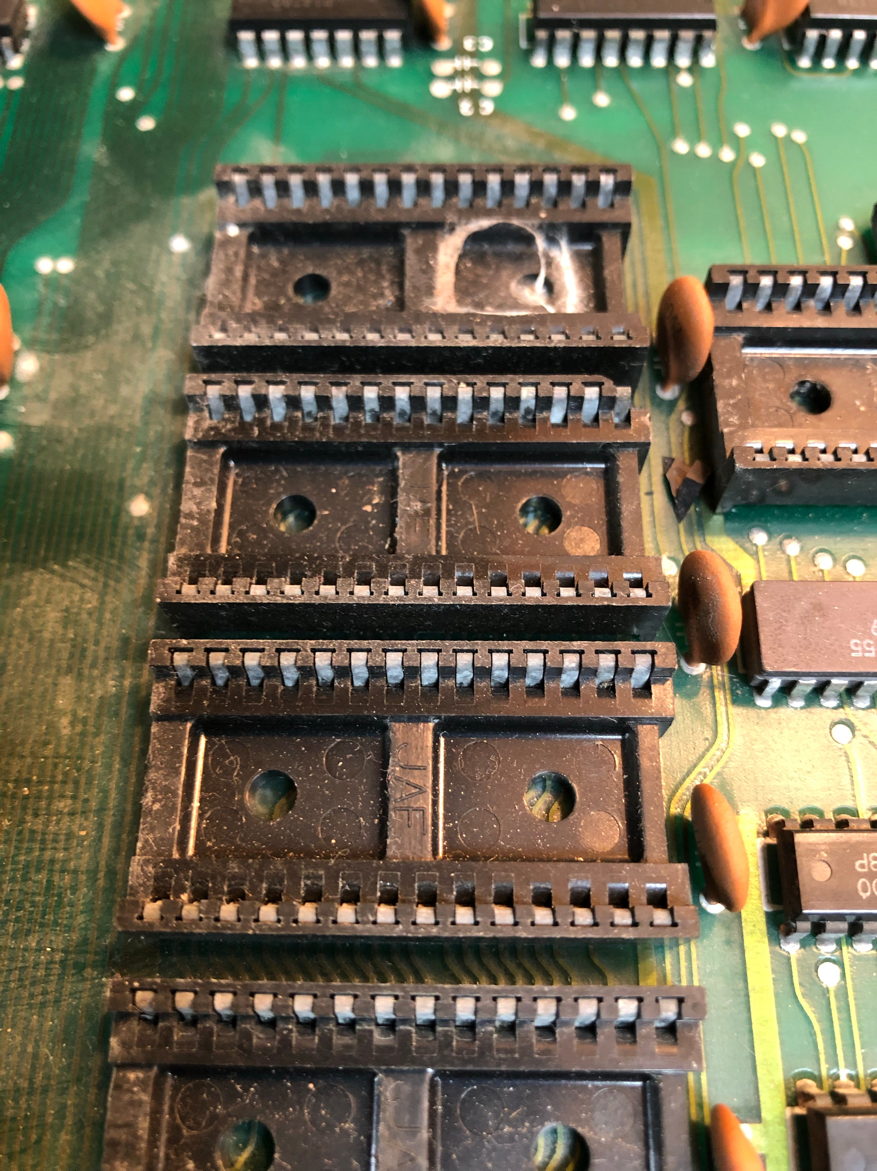 I went through my normal checklist and removed all the socketed chips, cleaned the legs, tested ROMS, etc. I popped and replaced this socket – they are not going to be reliable. Once done I’ll resocket the entire board set. There were 5 EPROMS that read bad during testing. I clean the legs using a fiberglass pen. It gets the flat sides of the pins pretty shiny, but in this cases I had to rub them side to side in the EPROM tester ZIF socket to clean the edges enough to get proper contact.. In the end only 1 EPROM read bad.