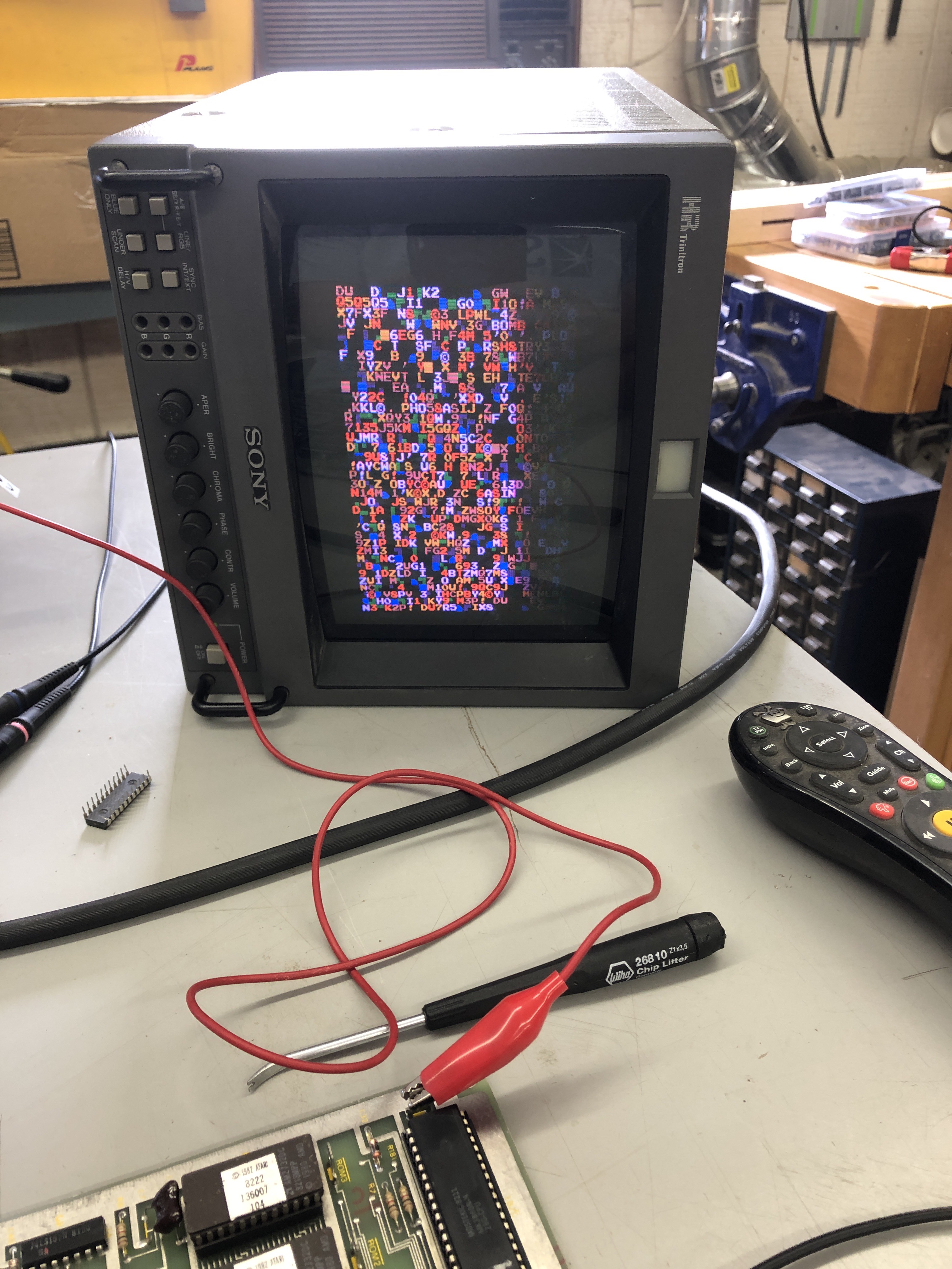 Here is the last issue, the screen had the top two lines replicated vertically on the left. It looked like a counter or something on that idea.. However – custom 07xx @4C was the root cause. ROM 115 also had a single bad byte. Replaced it.