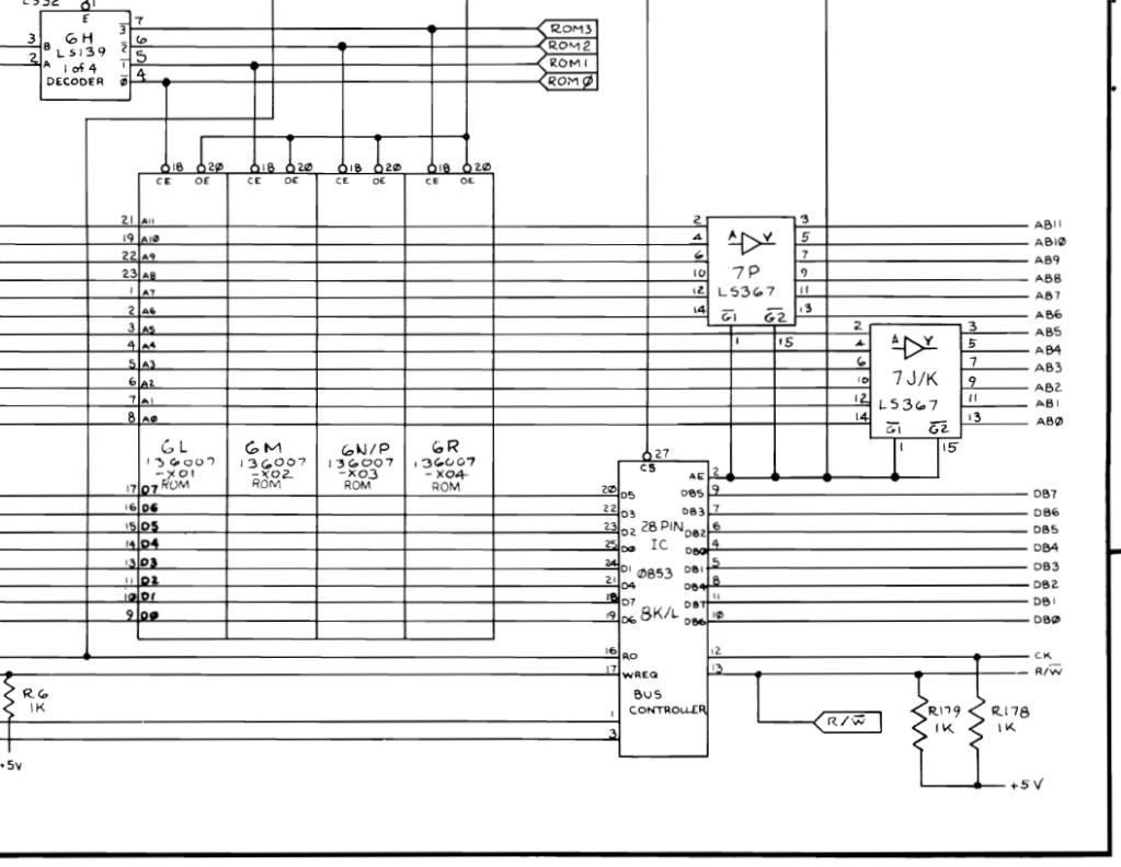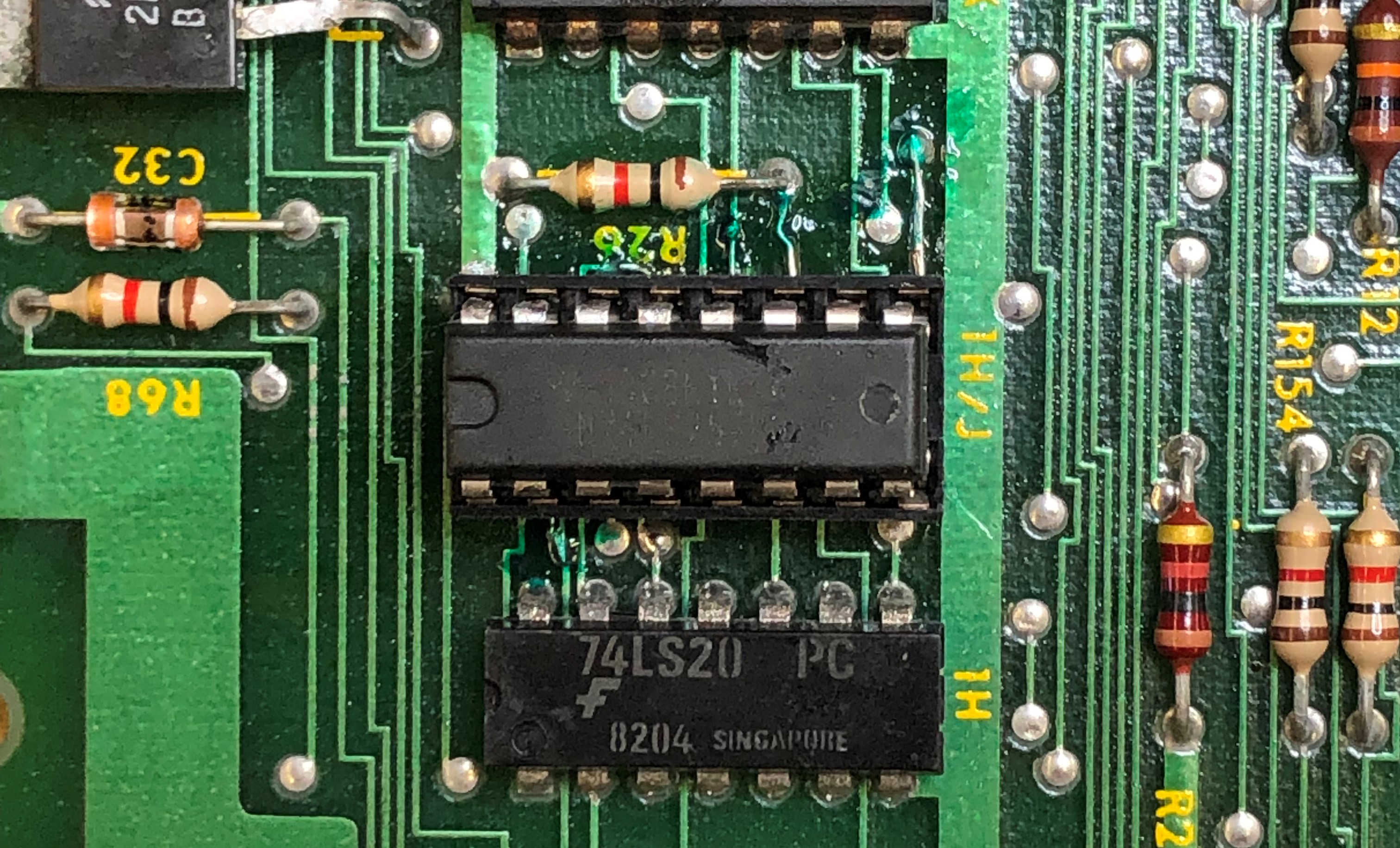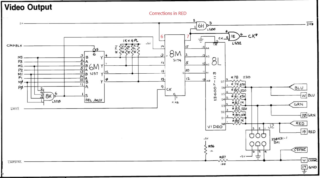 I looked at LS32 @1E. The CK signal on pin 5 (an input) was low. It comes from all of the 08xx custom chips which were known good. Most of the time outputs are the issue – I replaced the LS32.