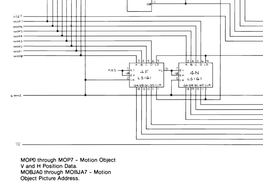 After another 16 hours of power on – the board was watchdogging. Bad 2114 RAM@9J/K. Then I noticed this graphics issue. If you look real close – the characters have blue stripes. I’ve had a similar failure in the past – but the stripes were actually missing which was a bad counter. I checked all of the LS161 counters in the motion object generator and they all were working.. I socketed the 2148 ram and that wasn’t it..