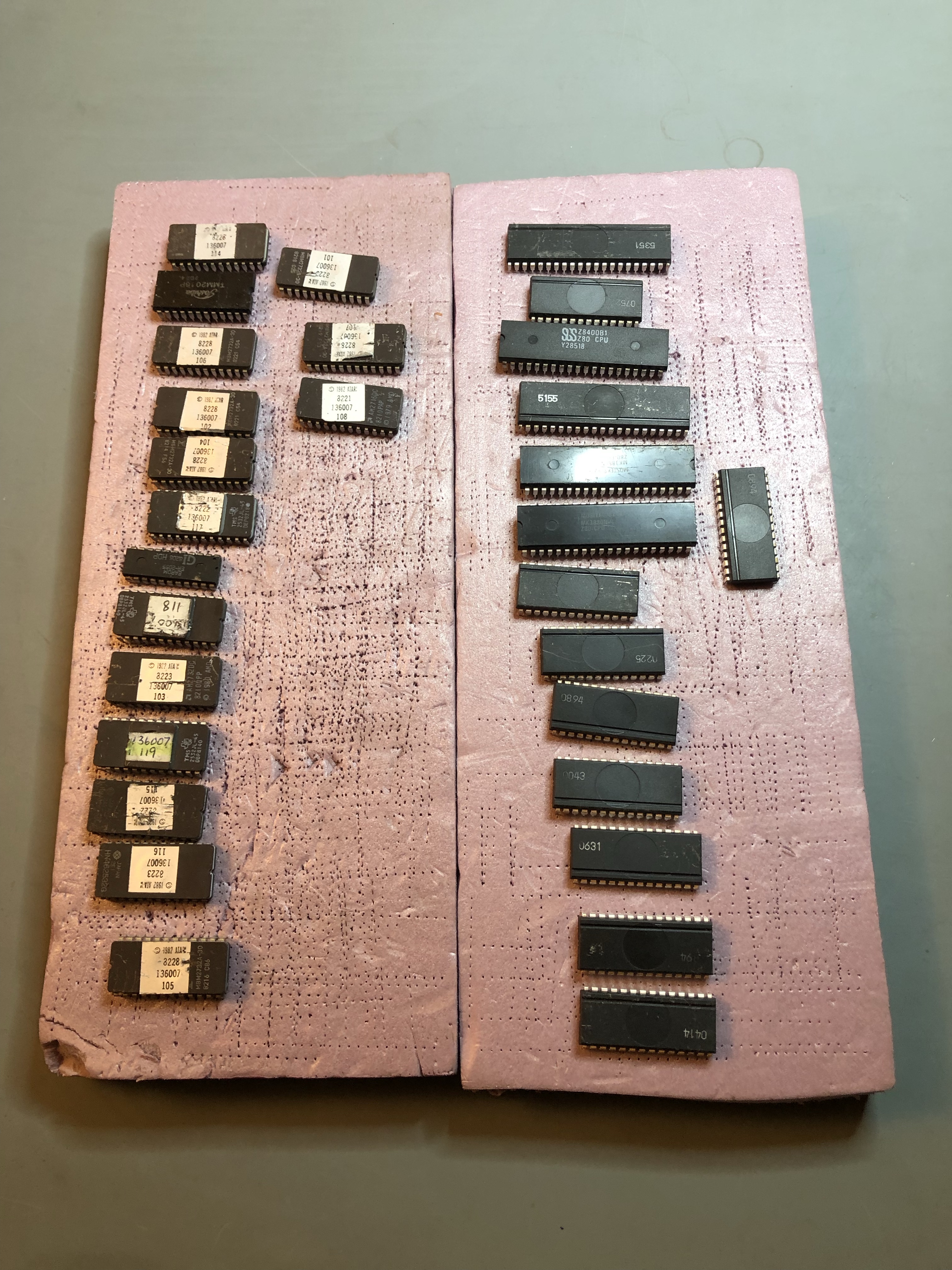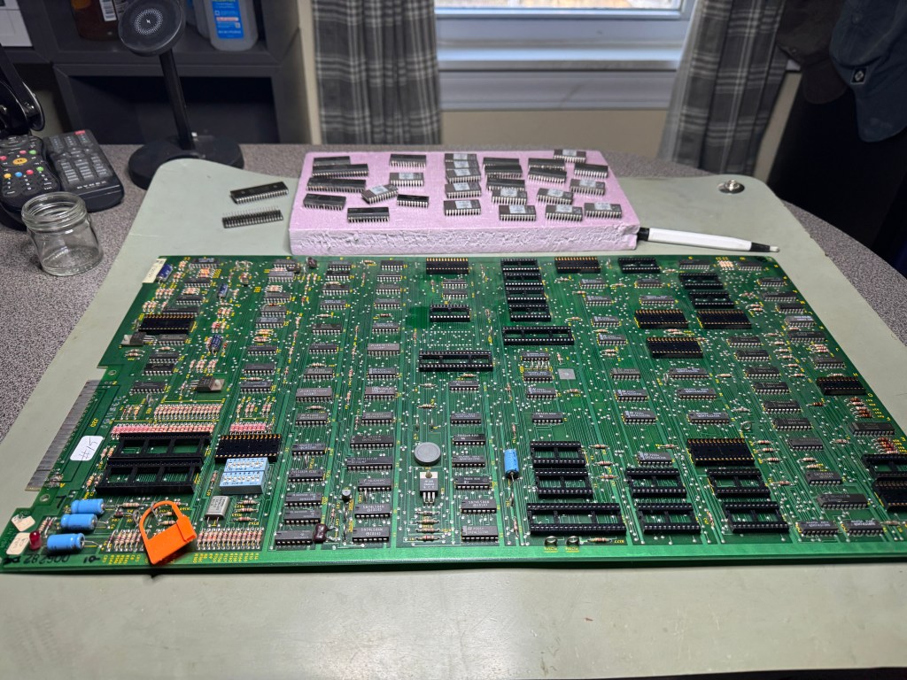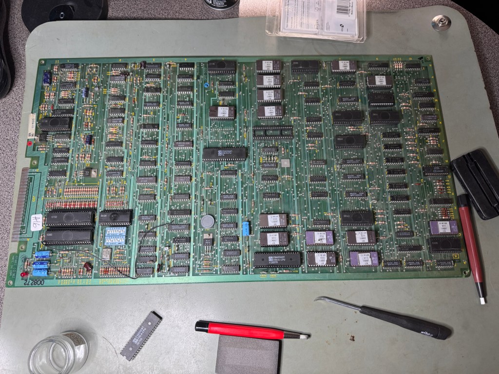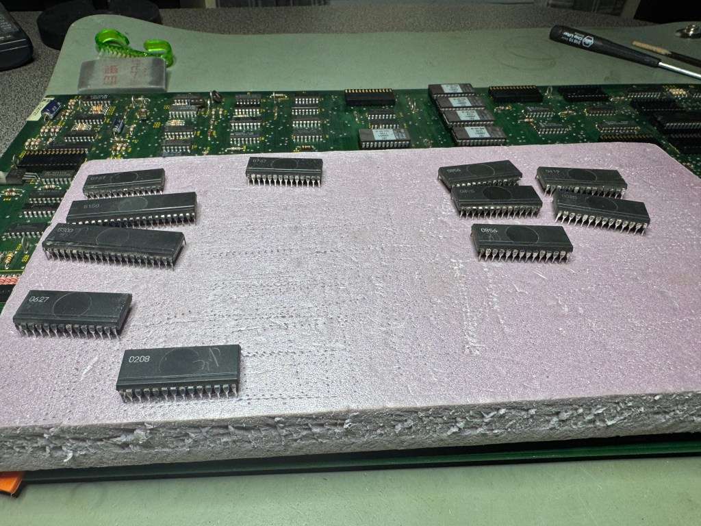 Step one is to remove all the socketed chips and clean the legs. The custom chips always have tarnish from their silver coated legs. They need to be cleaned as well as the others. I also bench test the majority of the ROMs. Most of them are not checked by the built in self test and any bad ROMs can cause glitches.