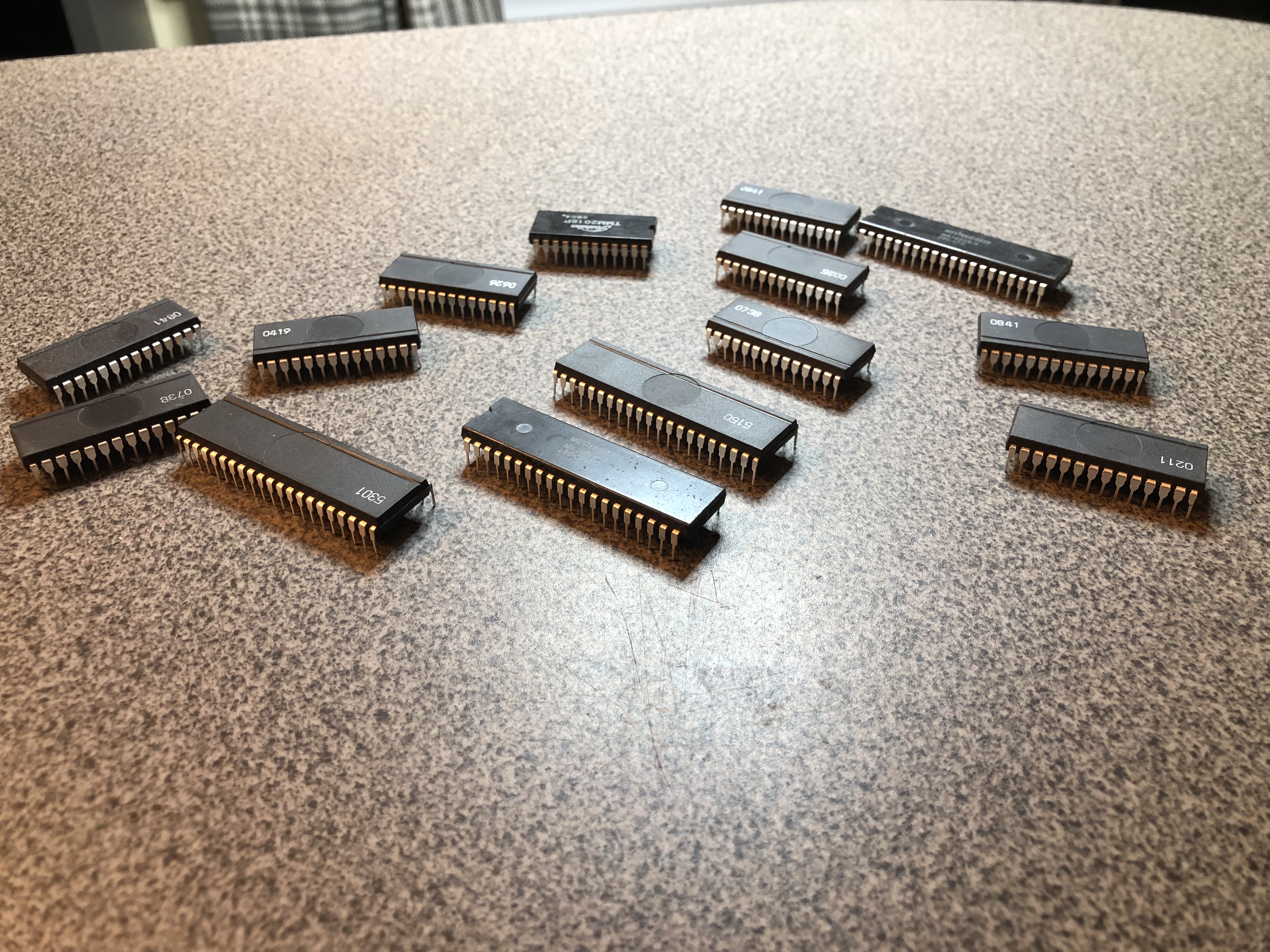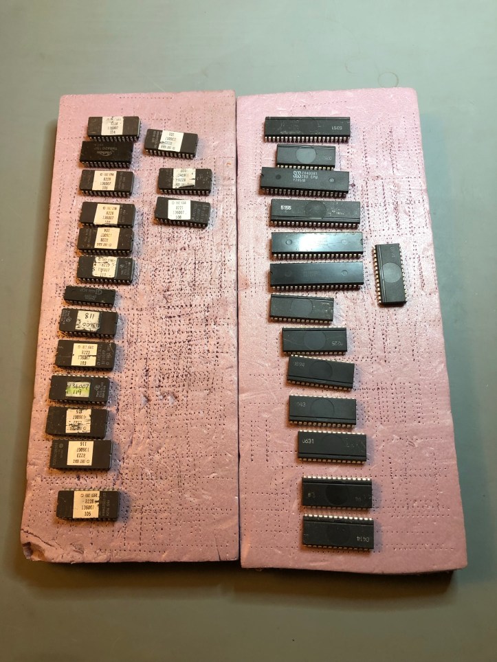 30 socketed chips. It takes 2 hours just to get to plugging in the board for testing after all the washing, brushing, Deoxiting, etc… But worth the effort.