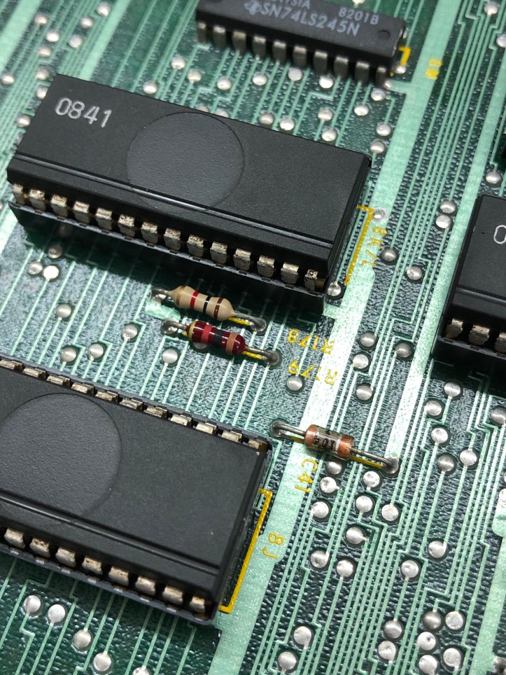 When these sockets were replaced, the traces on the parts side were really messed up. If you look close some end just before reaching the socket. The repair on the bottom was cleanly & neatly done AND it passed memory testing AND the RAM tested good off the board. So I didn’t start here at first – but the symptoms pointed to this repair.