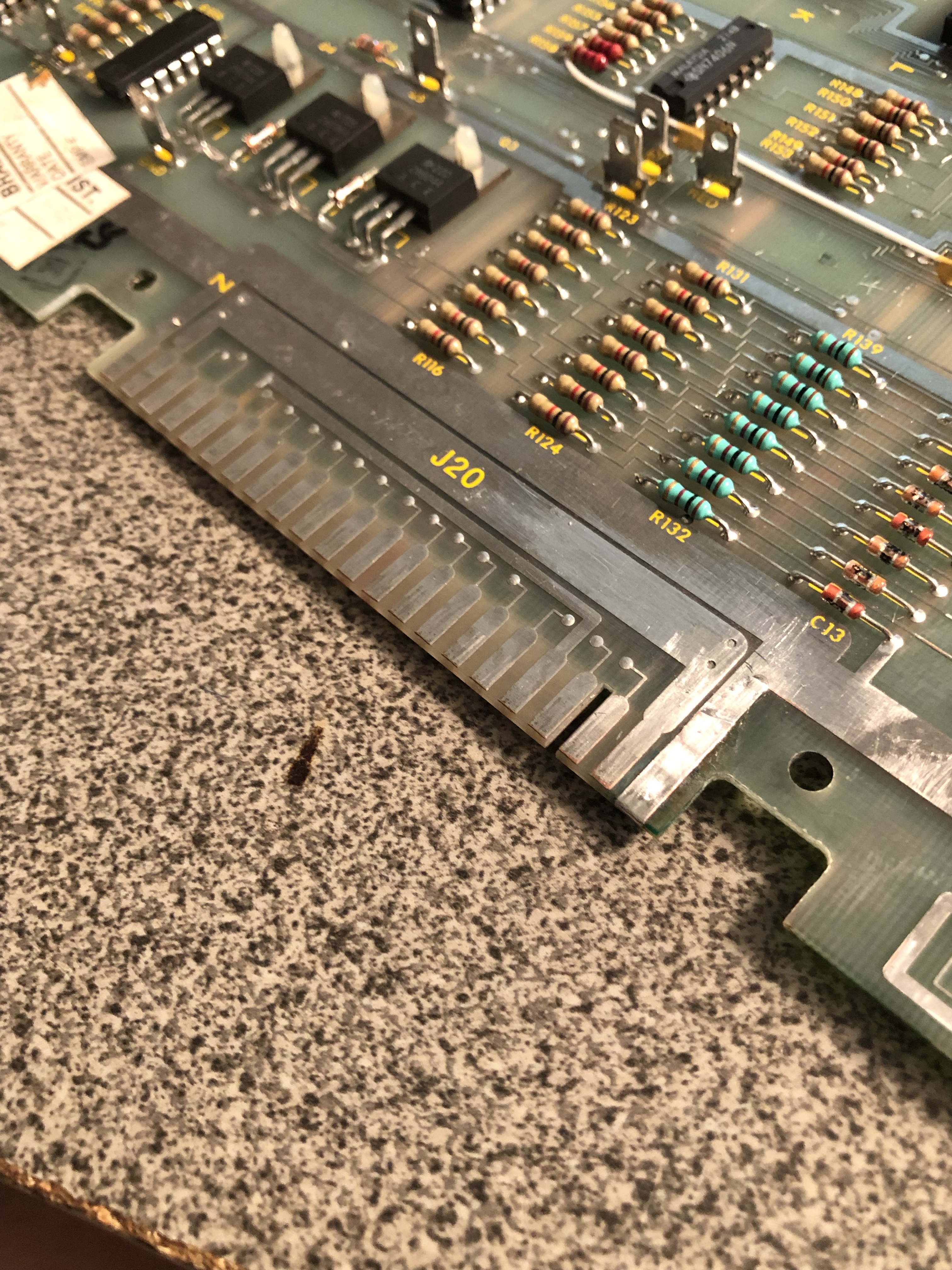 Board was one I had picked up at some point. The customs get really tarnished over 40 years. 10 minutes in Tarnex and hitting them with the fiberglass pen cleaned them up. This board had no prior work. It had a burned up ground finger (barely) and a cap that need to be resoldered.