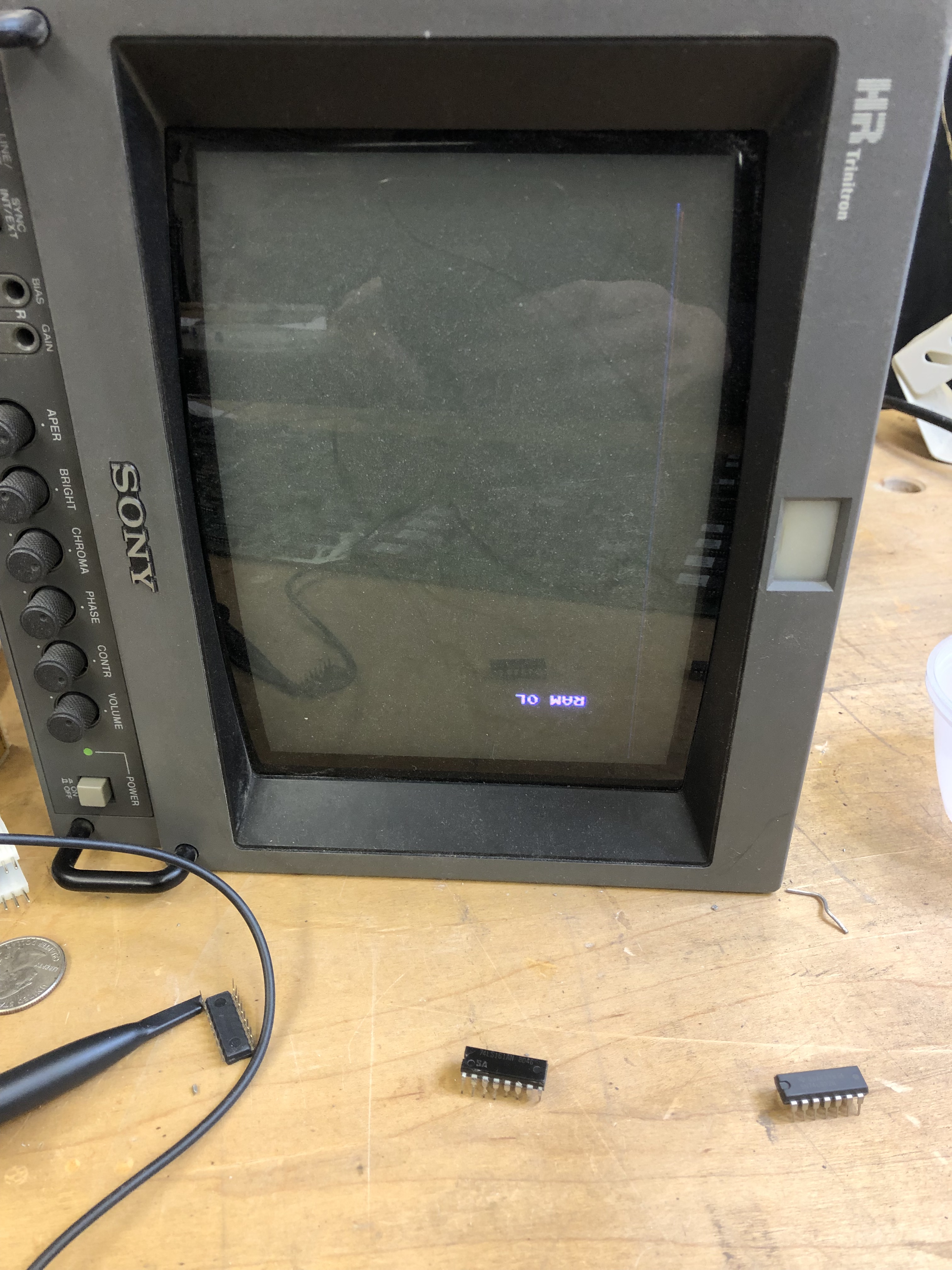 Once I got all of the RAM replaced, the board was still resetting and showing RAM 0L bad (which is the socketed RAM at 4K). The good news is the sync was good, even though the color was green. Since 0L is the first RAM in the test – obviously the diag program just couldn’t get to it.