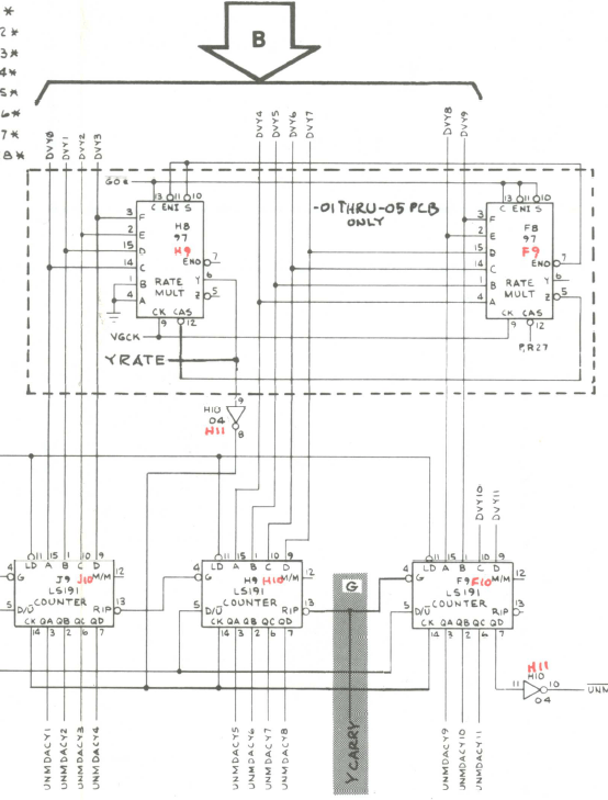 A quick look at the analog section showed it was doing what it was told and there was a digital issue. The vector generator working means that a lot of vector sections are working.. Looking at the XY position counter section I determined there were wasn’t X orY rate clock going into the counters. Makes perfect sense and explains dots moving around the screen.