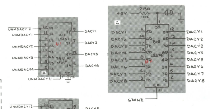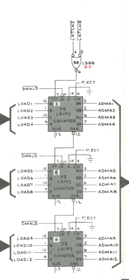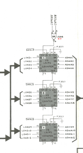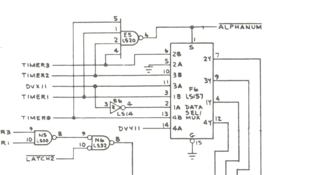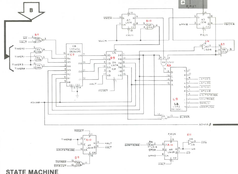 With the board running and watchdogging, I could watch all of the inputs and outputs of the STATE MACHINE and determine if the chips were doing anything at all. Working though all of the inputs and outputs – I came across the LS10@A8 – it had 3 input signals but seemed to have no output signal. Poor mans comparator – I piggybacked an LS10 with leg 6 lifted – there was my output.