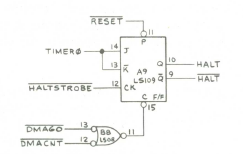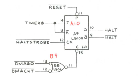Poking around the board – it initially looked like the LS109@A9 did not have a HALT signal that matched HALT (inverted of course). But @A9 was not the issue. Since everything was dead. It took a while to actually locate the offending chip. Finally I bumped into LS08@K6 Pin3 – no where near where I normally look for bad HALT problems.