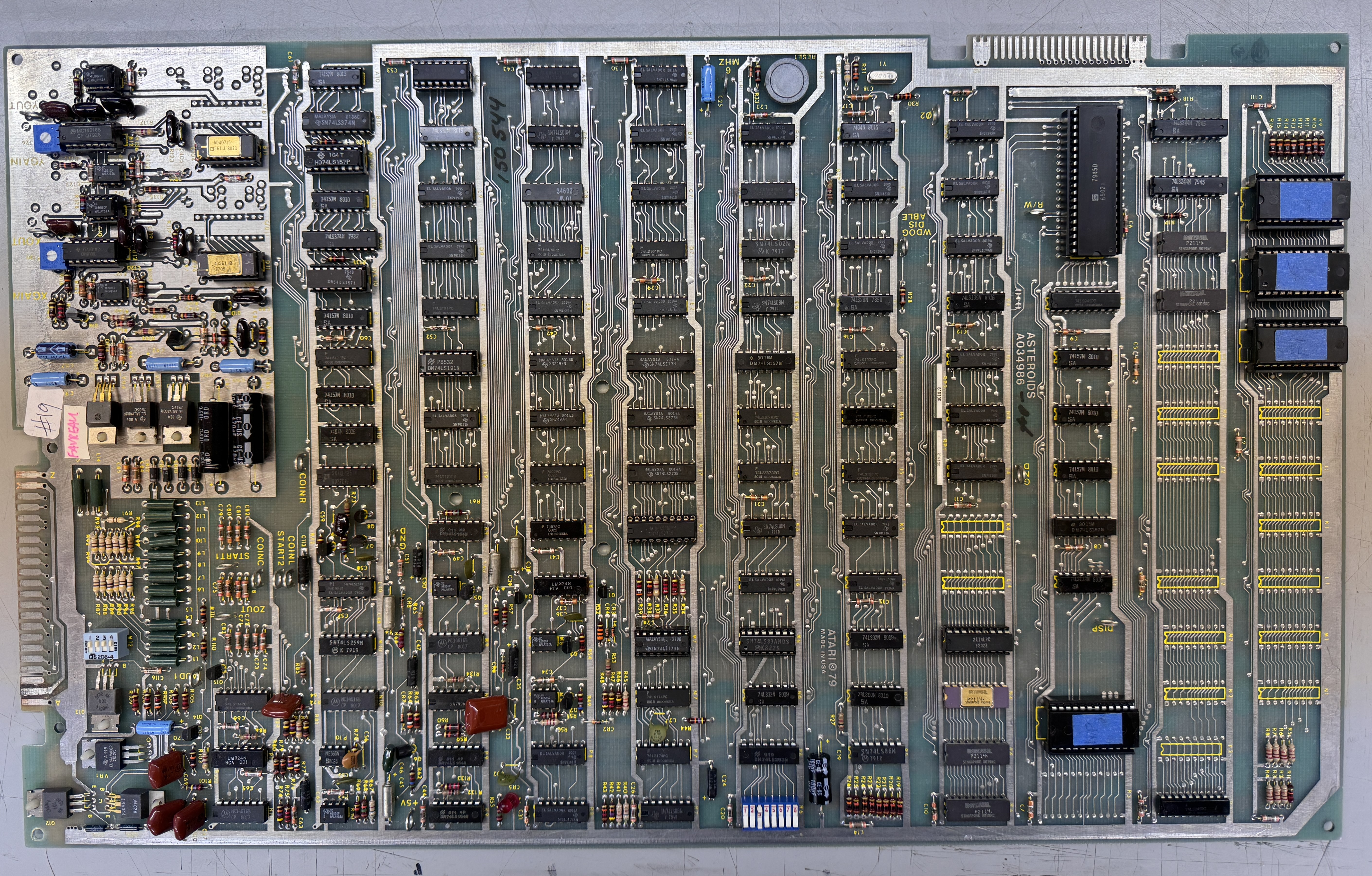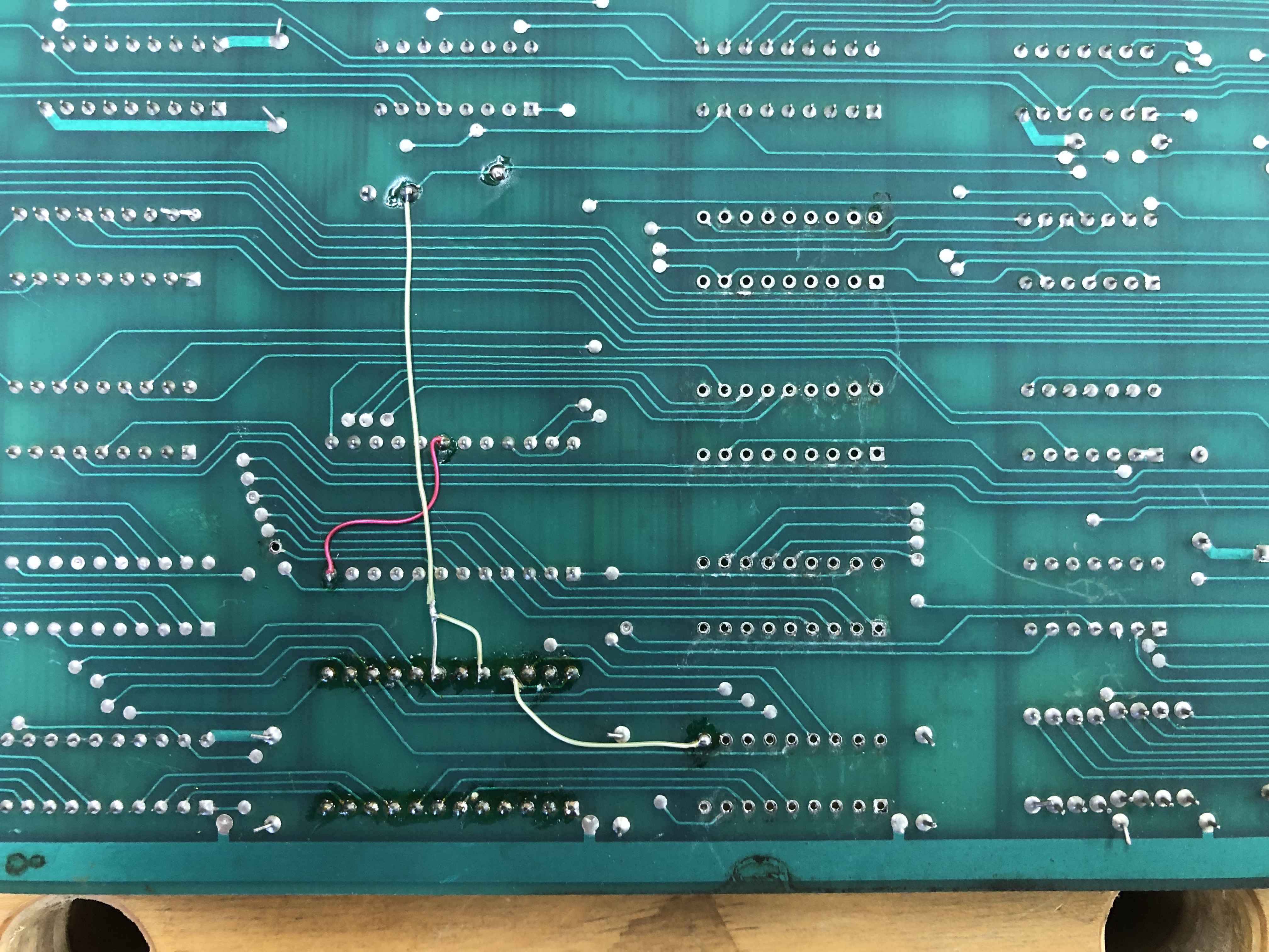 This board also had an interesting mod. Someone replaced the 4 RAMs @M4, N4, P4, R4 with a 6116 @R3. Here are a few jumpers on the back and they cut a few traces. It all seemed to work however.