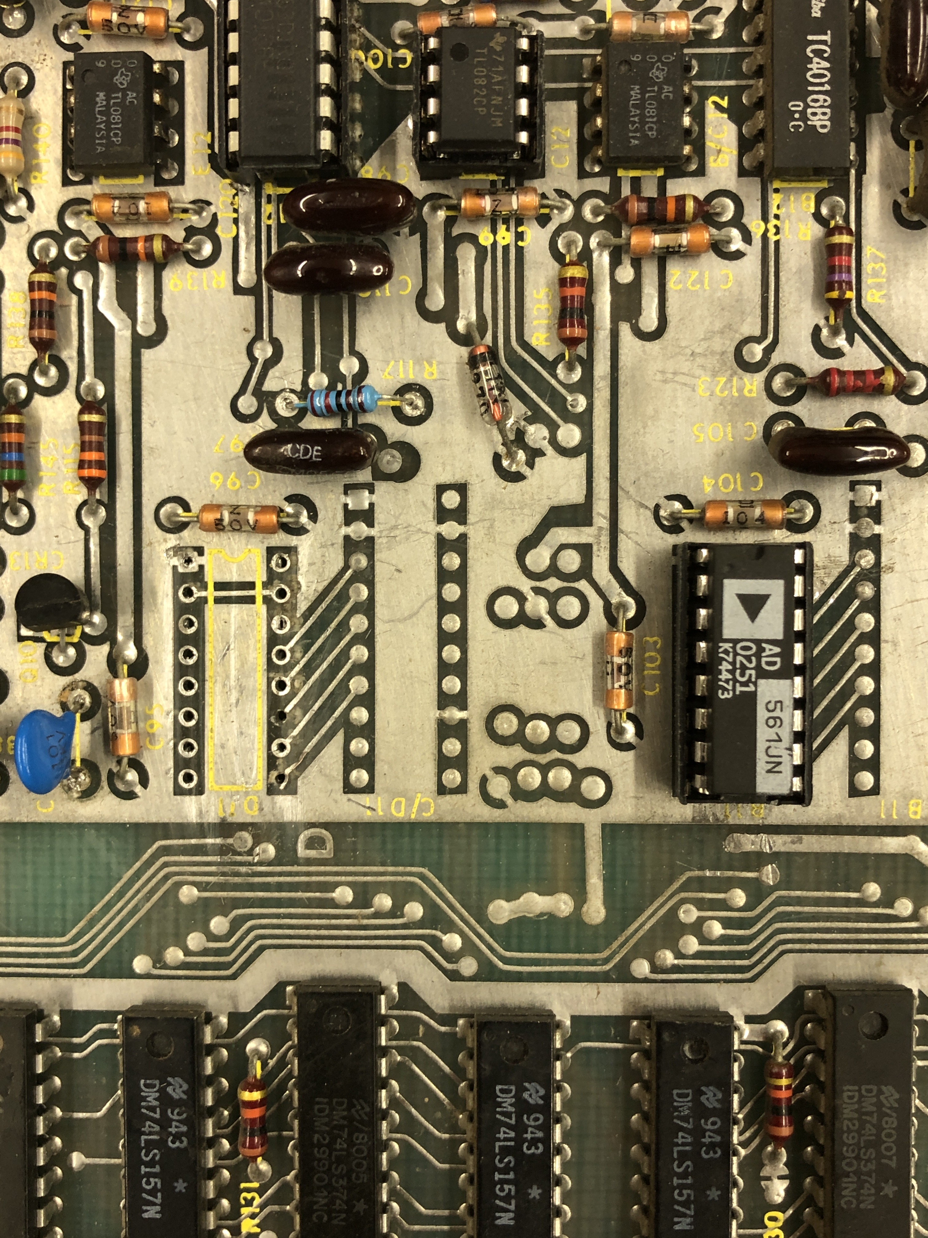 I scoped my way through this part of the circuit following the noise signal into the LM324.. with nothing coming out. Replaced it. No change. At that point I checked each component around it looking for issues. When I got to R103 – it read nearly a dead short. Pulled C69 – a green gumdrop cap and R103 was fine. The cap shorted internally of course.