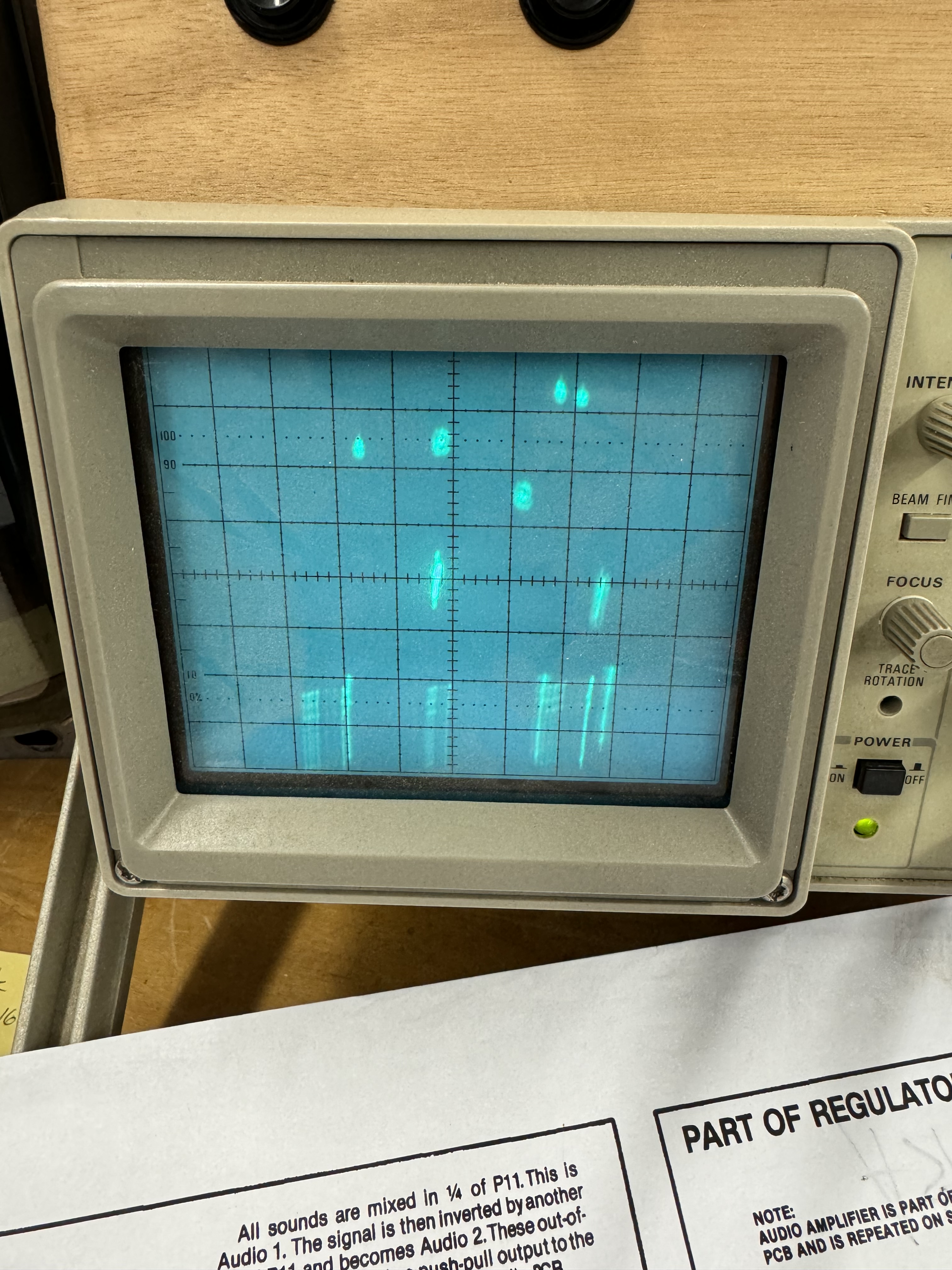 Powered board on and game appeared as just dots on the scope. Asteroids and ships moving around as dots essentially. All RAM and ROM tested good and the vector generator also tested good. When that happens the issue is often in the analog section (but not always).