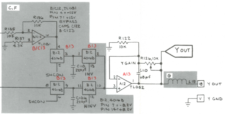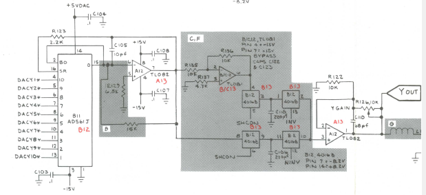 The signals on the TL082@C12 Pin 1 and 7 looked normal as well as the ones on the X side. I worked backwards and it appeared that he input to DAC@B11 Pin 6 (DACY3*) was missing (no pulse) So maybe the zigzag is a 3 bit error? Working backwards again…