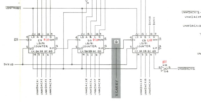In this specific case, the 74191@C9 (not an LS191 on this particular board) had a grounded/shorted output on PIN6-UNMDACX11. Interestingly the carryover bit on PIN7 was working just fine..