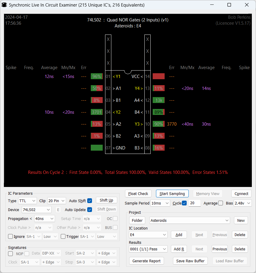 Sitting on this chip at 40ns and waiting for it to ‘warm up’, The board started running after ~5 seconds of power and propagation speed dropped below 50ns. The LS02 eventually ‘speed up’ further and passed at 40ns and tested correctly.