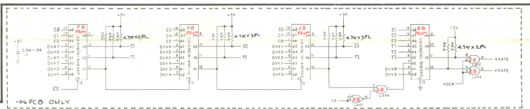 The -06 revision is loaded with 4 – 82S131 PROMs that calculate the X and Y rate. I’ve bumped into this board revision once before and the E8 PROM was the issue. Checking the PROM@E8 I saw ‘some’ inputs and no outputs. I removed and checked it and it read good. After socketing and reinstalling I got horizontal lines on the screen (this is a problem.. read on…)