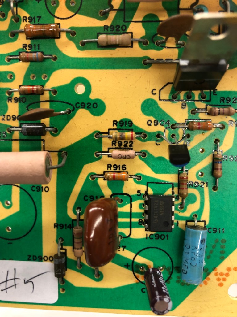 The HV board had a number of problems. Obviously the burned up area needed attention. Another notable find was R901, R907 were only 1 ohm and visibly overheated. I haven’t seen reference to this low a value in these. The FAQ and other guides recommend 3.9 ohm, 3W resistors. They got replaced. R906 was pretty toasty as were a couple others..