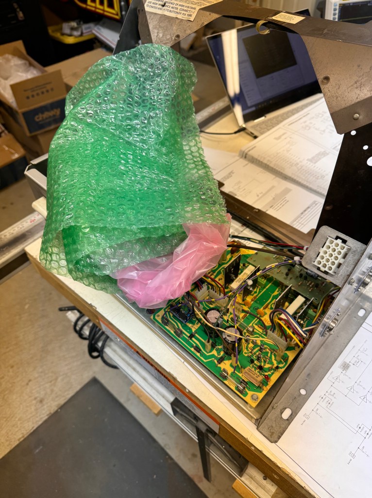 Once all the maintenance was done – I normally test the deflection board with Tempest because it has a particular vector chatter. This time it sounded a bit off. Once I got the HV unit in – things were wrong. Chased my tail a bit at first – on the LV6100 – one of the voltage regulators was getting burning hot and shutting down.. Long story short.
