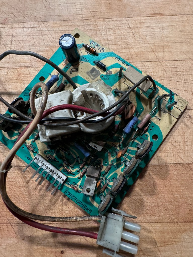 Here is where it started. Many components have been replaced – there is a lot of prior work. I didn’t get a good angle – but many of the replaced parts are floating way off the board, mostly diodes and the resistors. Many of the new blue resistors are very over wattage from what I can tell. My concern with that is they can allow other components to burn up during a failure (or worse) when they should go first..