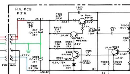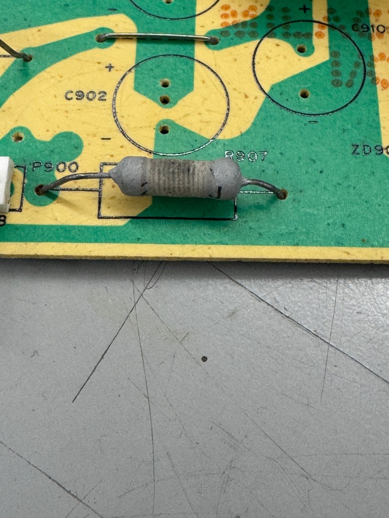 R905 in the HV unit was just toasty enough to get replaced. R901/R907 got replacement 3.9 ohm resistors per the FAQ. Replaced ZD900/901.