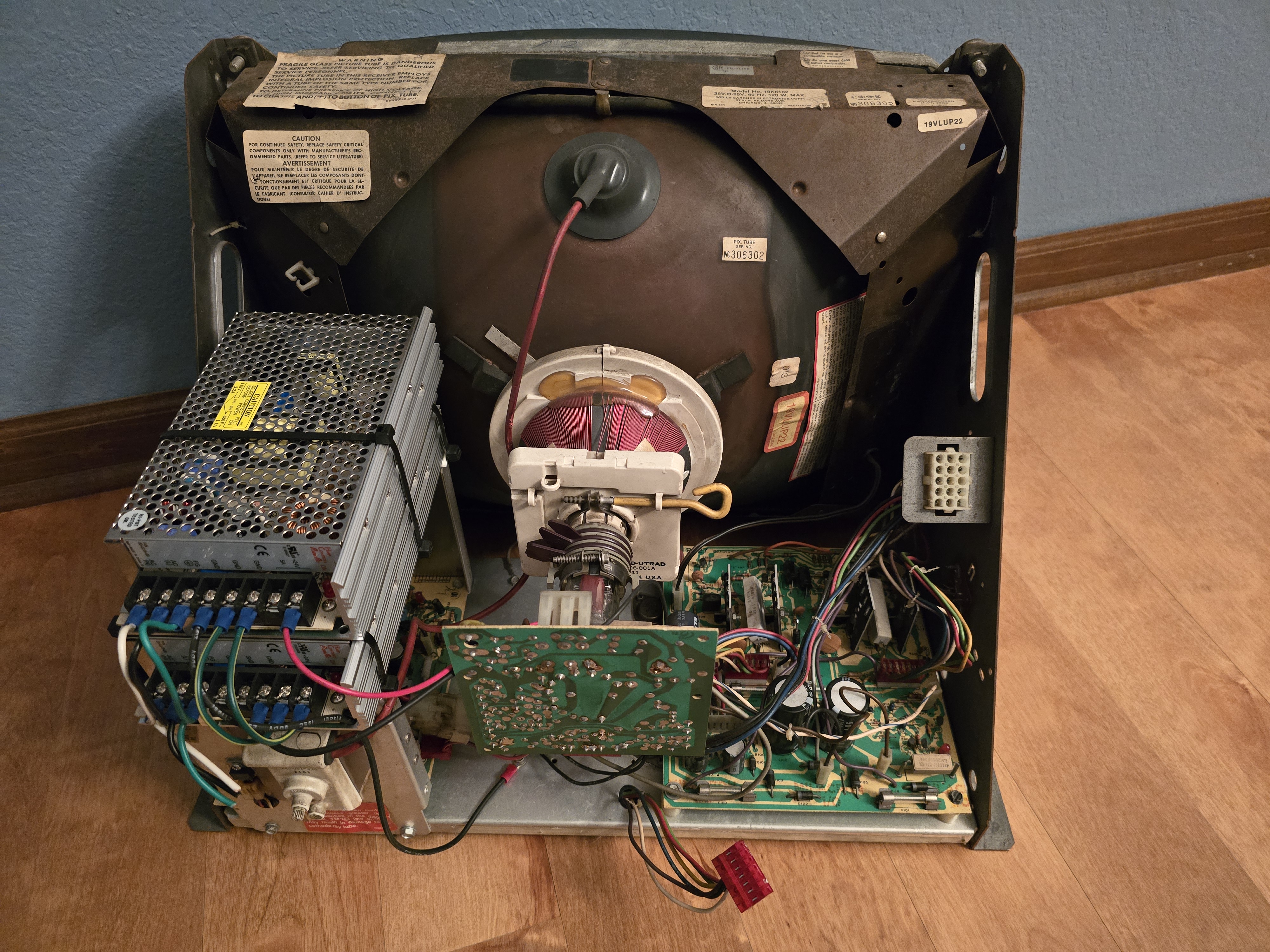 First time receiving an entire monitor frame with the chassis (no tube) – but after working on it.. this is a really good way to get a 6100 up and running again. I was able to test and reseat all of the bottlecap transistors and moving my tube from my test 6100 to this was easy.