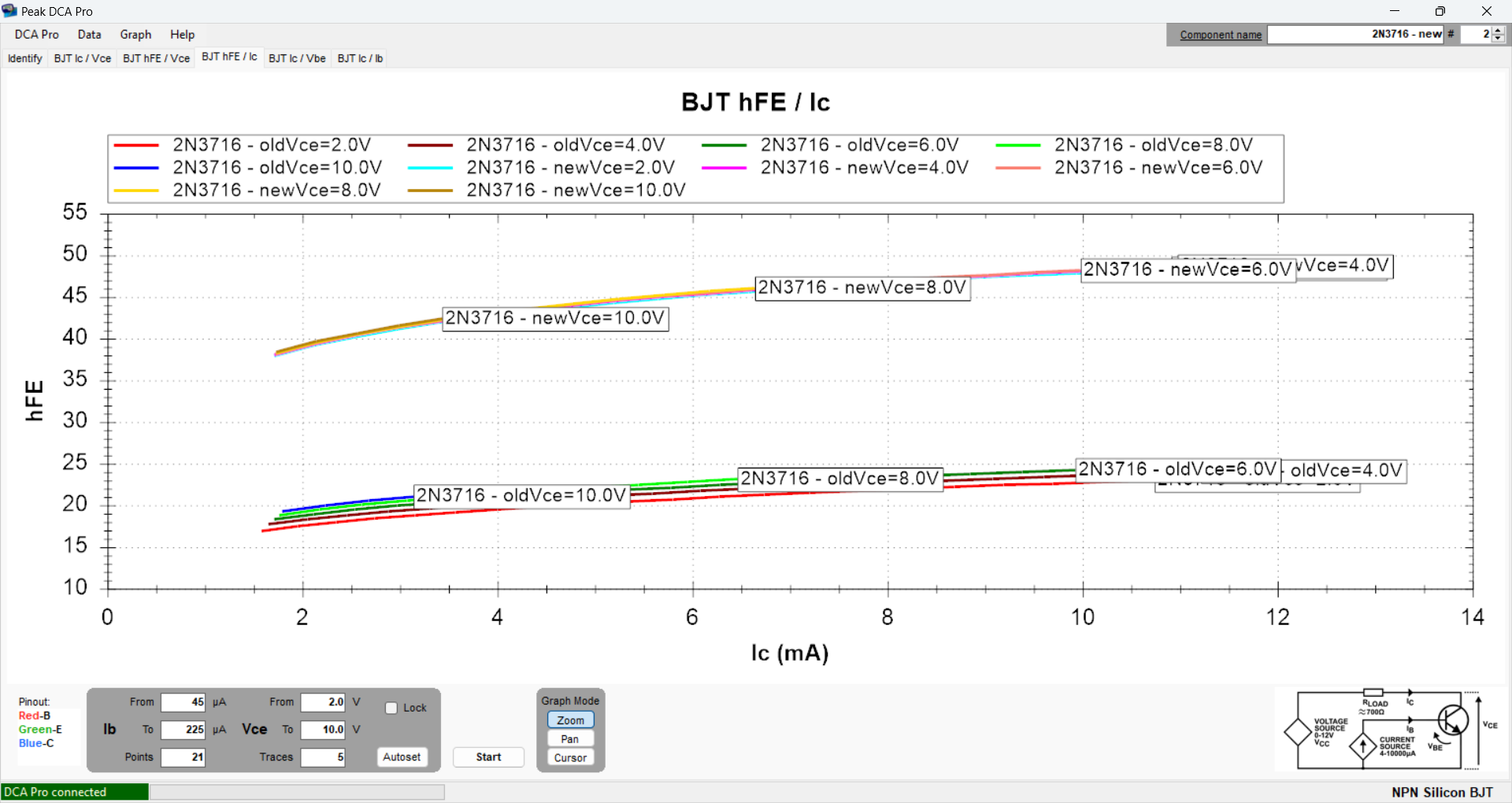 I ran the charts and these two stood out. You can see 2N3716 old vs. new. The old one was not generating enough gain. The important part here is the transistor can check good with a standard meter (i.e. normal voltage drops, not shorted, not open, etc.) It drifted out of spec over the years. It’s one of the reasons I need the monitor frame to test and make sure the chassis is 100%!