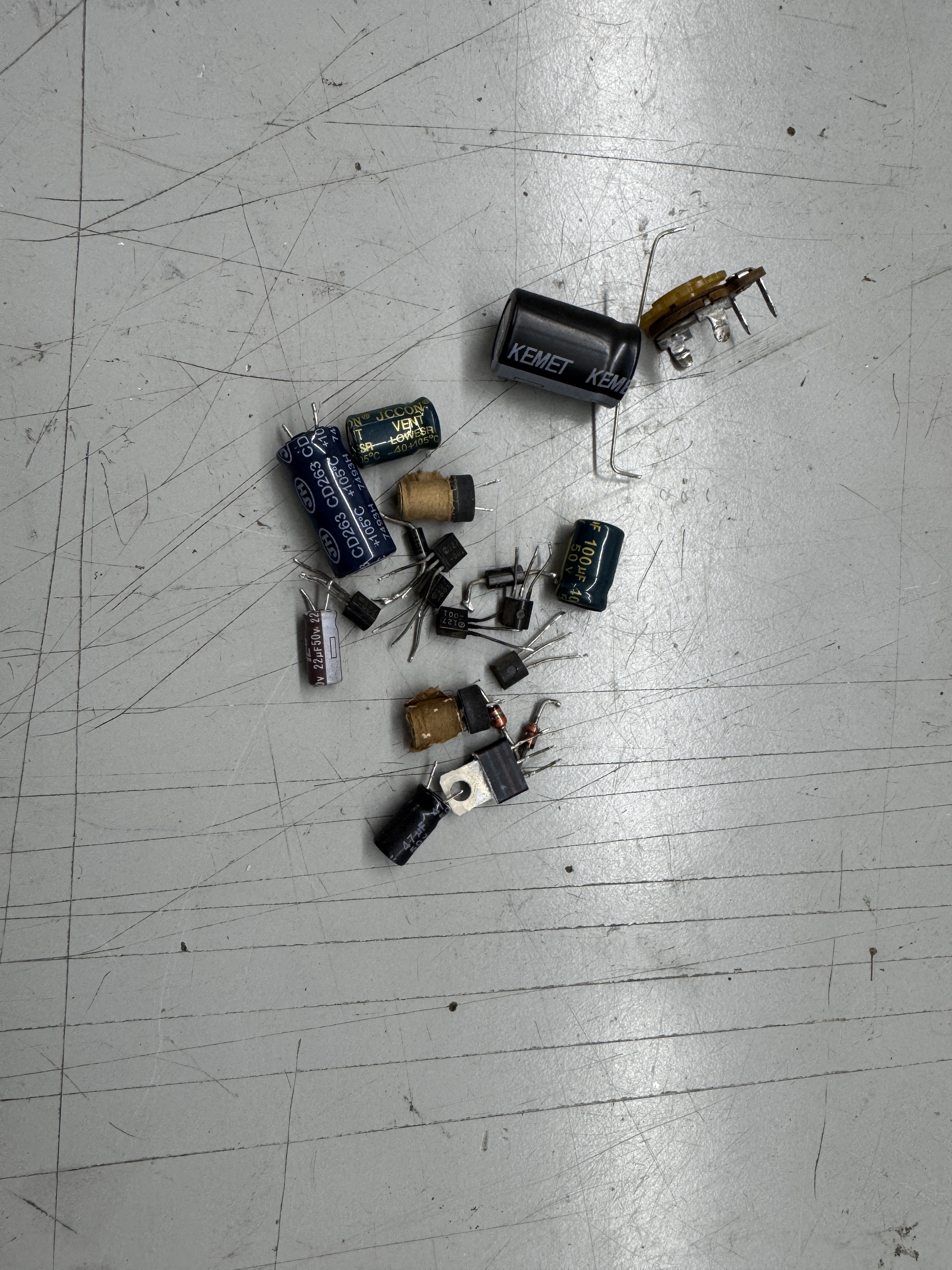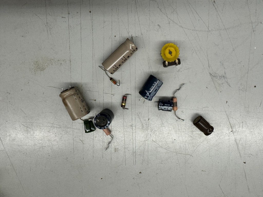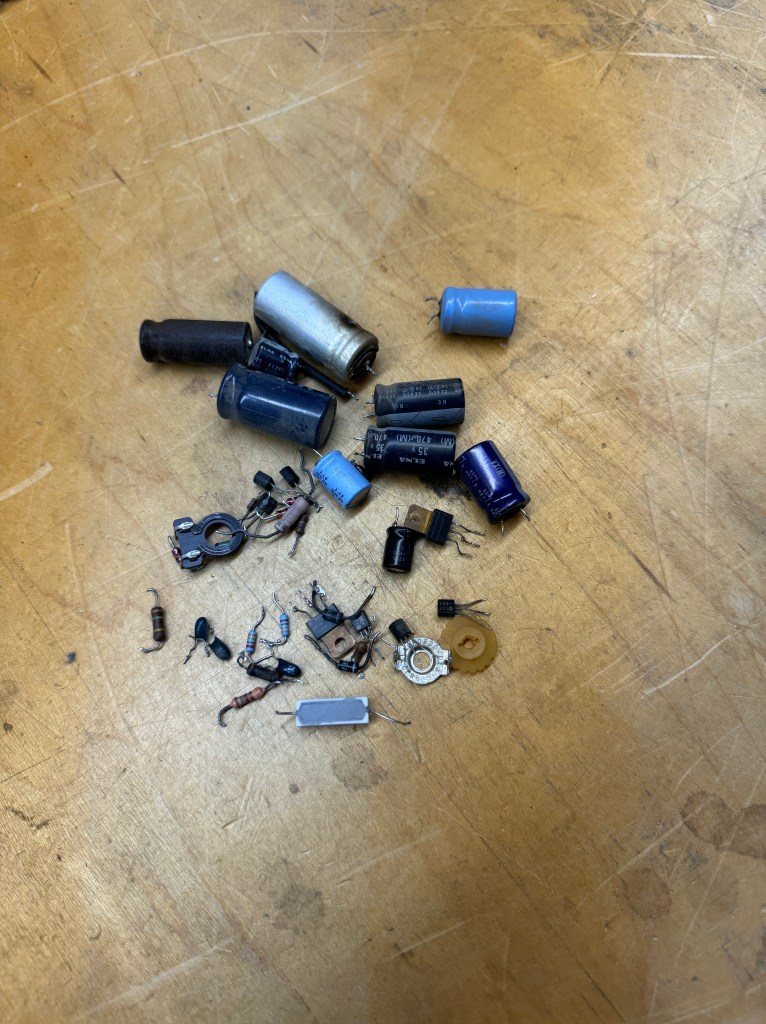 Here is pretty much all of the debris removed from the chassis. Fried diodes, toasty resistors and the caps which just get replaced.