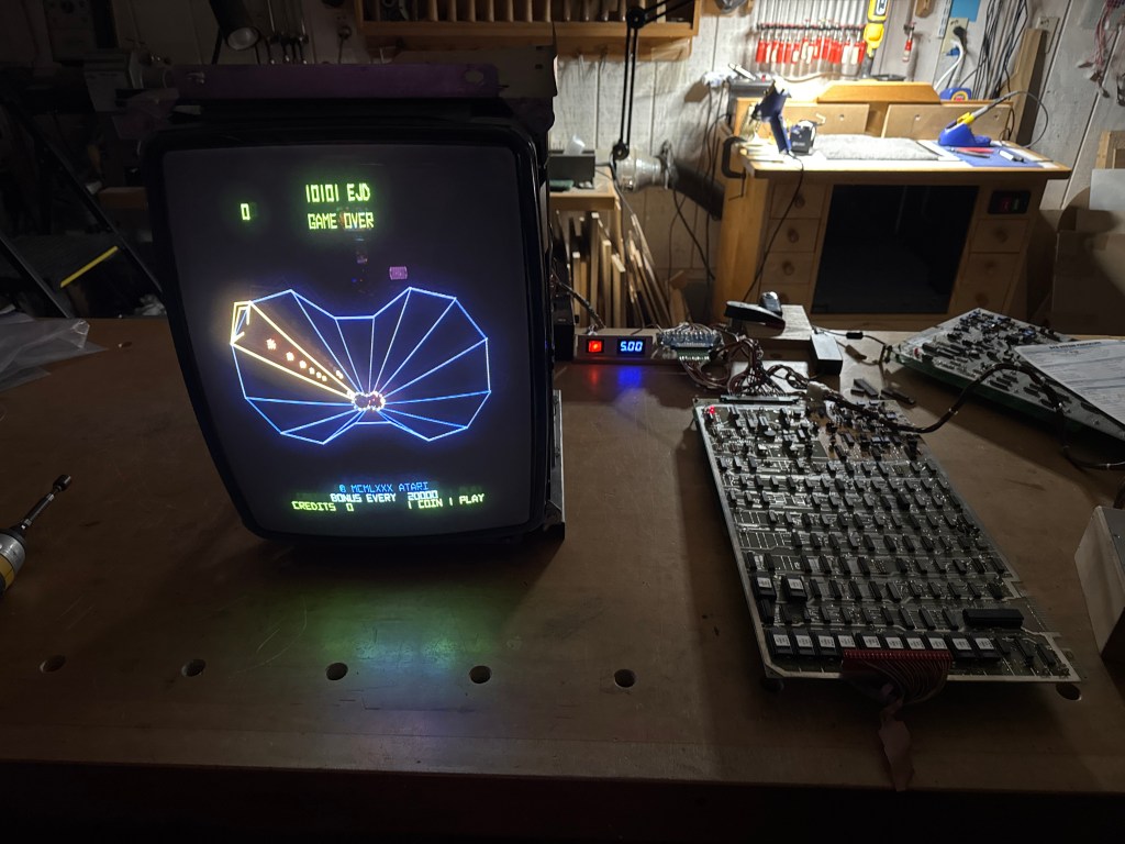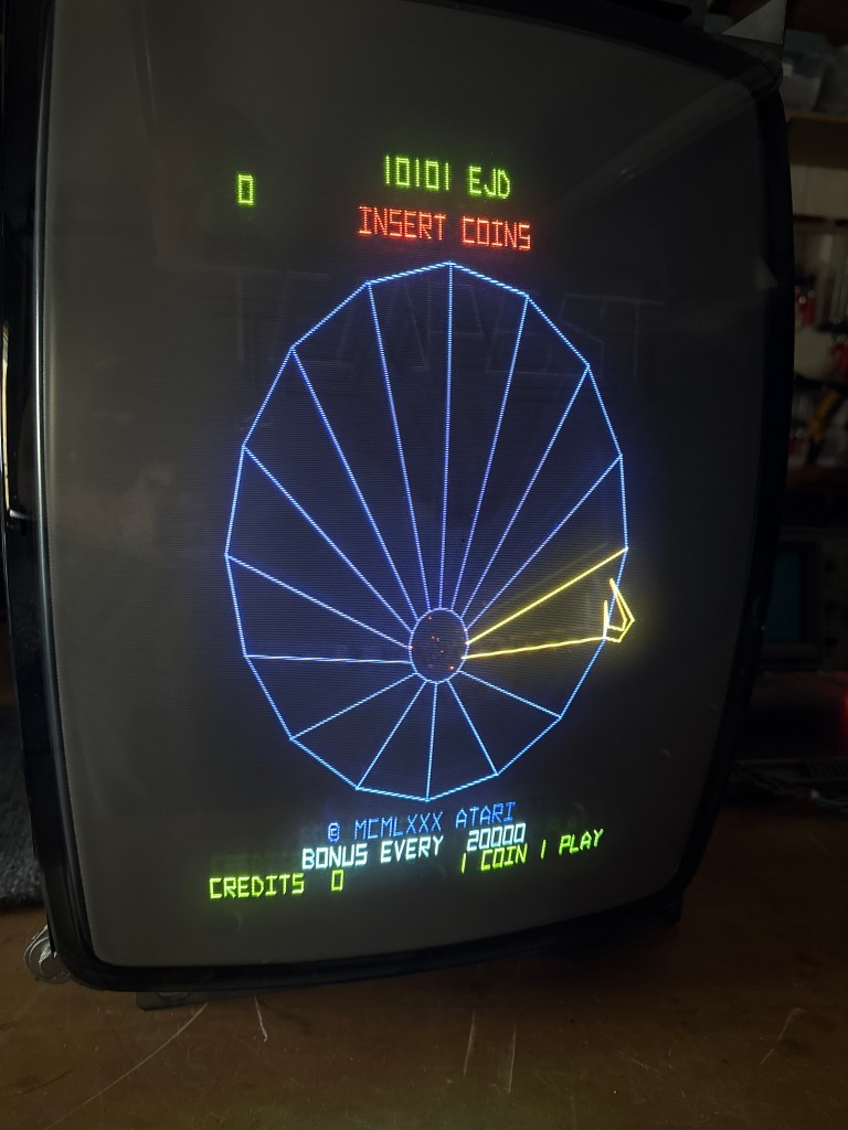 Deflection system running great! No issues that I can hear or see. I like to test deflection with Tempest pcbs. Tempest generates a very distinct sound pattern which ends with a sort of revving up low to high speed chatter/whine that coincides with the Tempest logo growing full size on the screen. Once I hear that I know the deflection system is fully operational. Tempest also has the reset button on the PCB. Hold it down and make sure the spot killer comes on to verify that circuit.